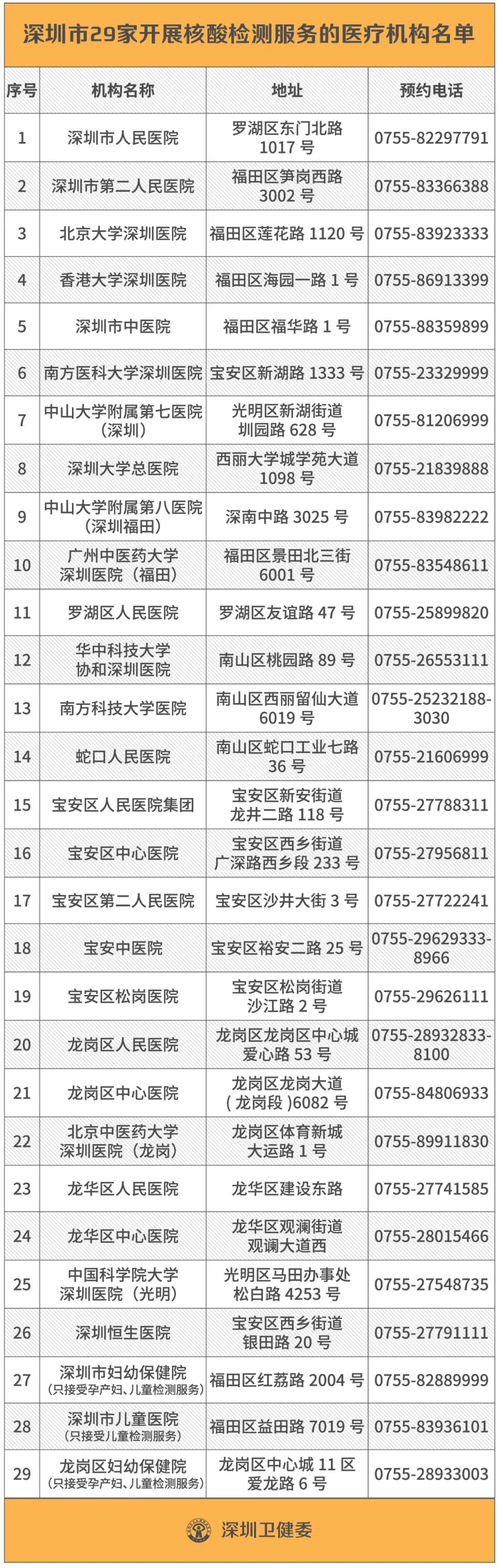 跨境學(xué)生可聯(lián)系全市提供核酸檢測(cè)的29家醫(yī)療機(jī)構(gòu)(詳見附件,含醫(yī)院名稱、地址和聯(lián)系電話)中的任意一家進(jìn)行檢測(cè),部分醫(yī)院有預(yù)約要求,部分醫(yī)院對(duì)檢測(cè)服務(wù)時(shí)間有限定,因此首次前往檢測(cè)前,請(qǐng)先拔打聯(lián)系電話了解醫(yī)院是否需要預(yù)約和服務(wù)時(shí)間安排。