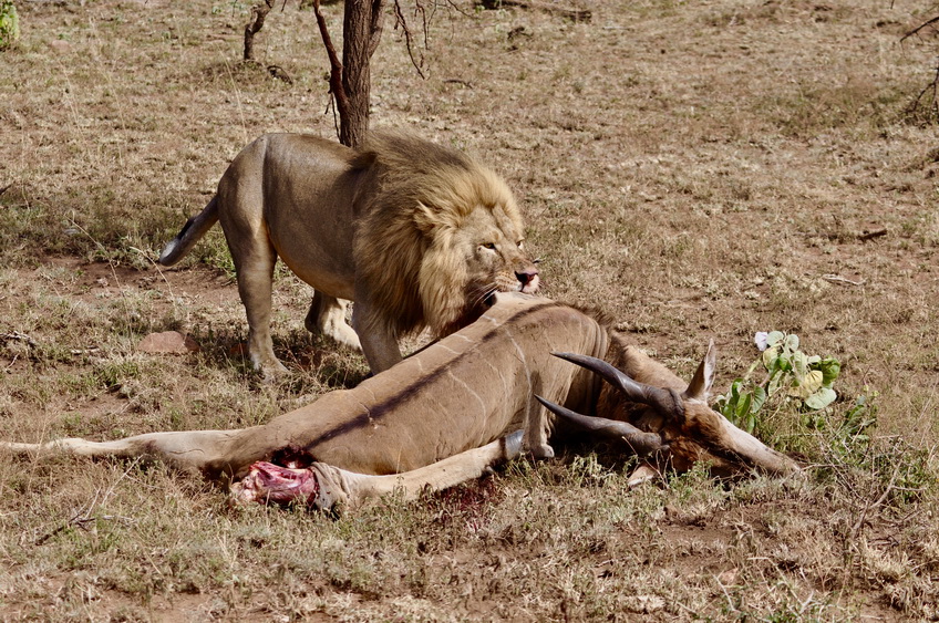 這頭估計重達二、三百斤的大羚羊是早晨被三頭雌獅捕獲的,雄獅趕到后,雌獅們各自撕扯一塊肉到遠處享用去了。雄獅腹中饑餓,不顧乘坐兩臺越野車的十位游客近在咫尺,只管用力撕咬拖拽羚羊尸體。