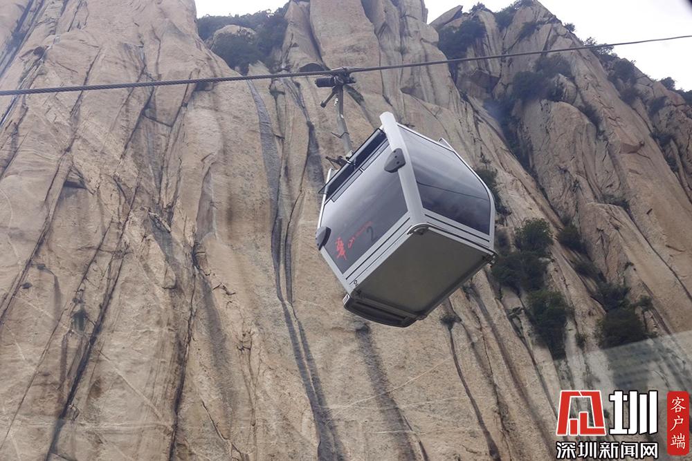 華山西峰的太華索道是迄今為止世界上第一條采取崖壁開鑿硐室站房、兩上兩下的起伏式走向、設中間站的單線循環(huán)脫掛式索道,總計投資5億余元建設。李酮攝。