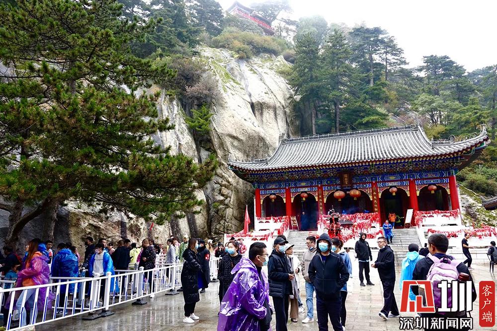 共有72個半懸空洞,道觀20余座,其中玉泉院、都龍廟、東道院、鎮(zhèn)岳宮被列為全國重點道教宮觀,有陳摶、郝大通、賀元希等著名的道教高人。排隊等待參觀的游客。李仁奇攝。