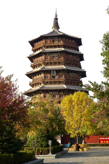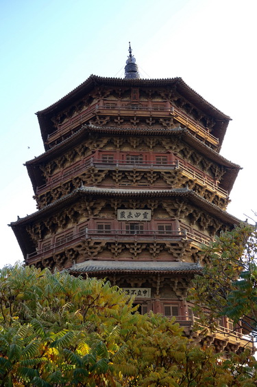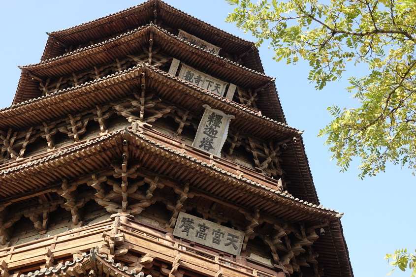 釋迦塔高67.31米,底層直徑30.27米,呈平面八角形。全塔用紅松木料3000立方米,重2600多噸,純木結(jié)構(gòu)、無(wú)釘無(wú)鉚。塔內(nèi)供奉著兩顆釋迦牟尼佛牙舍利。李仁奇攝