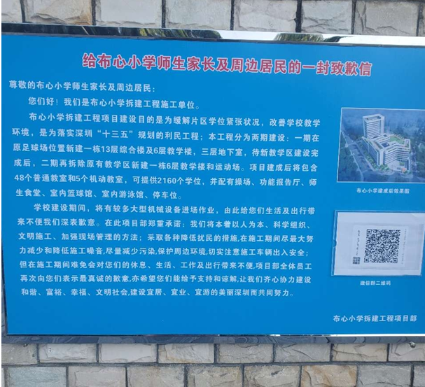 對于家長最關(guān)心的學(xué)生安全問題,羅湖區(qū)教育局回應(yīng)道:“建設(shè)方案經(jīng)過專家論證評審,對原有教學(xué)樓無安全影響。實(shí)施過程邀請第三方安全監(jiān)測單位對教學(xué)樓進(jìn)行監(jiān)測,頻率每天一次,確保安全。施工過程還將采取一系列安全文明施工措施:一是易起塵作業(yè)面100%濕法施工;二是裸露土及易起塵物料1做到00%覆蓋;三是每個(gè)出入口100%安裝沖洗設(shè)施;四是安裝隔音圍擋;五是錯開教學(xué)時(shí)間施工等。把影響學(xué)校的安全及教學(xué)環(huán)境降到最低?!背艘酝?,布心小學(xué)已成立建設(shè)安全領(lǐng)導(dǎo)小組,不定期召開家委會通報(bào)建設(shè)情況。羅湖區(qū)教育局相關(guān)安全辦和基建科室,也實(shí)時(shí)掌握和管理項(xiàng)目建設(shè)安全情況。