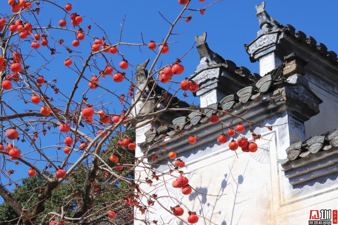 柿子熟透了,齊齊整整地掛在枝丫上,與灰瓦白墻相得益彰。