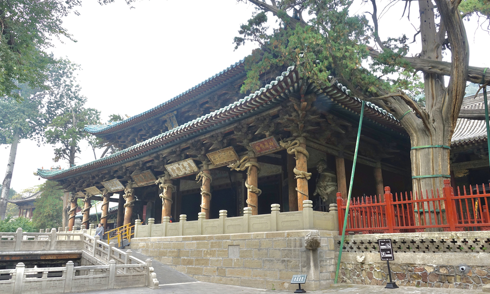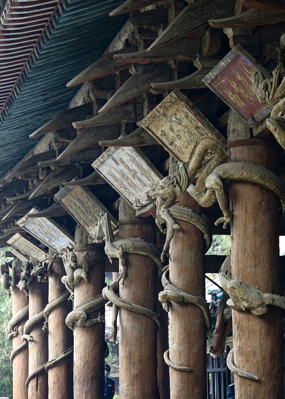 圣母殿前柱上的八條木雕盤龍。李仁奇 攝