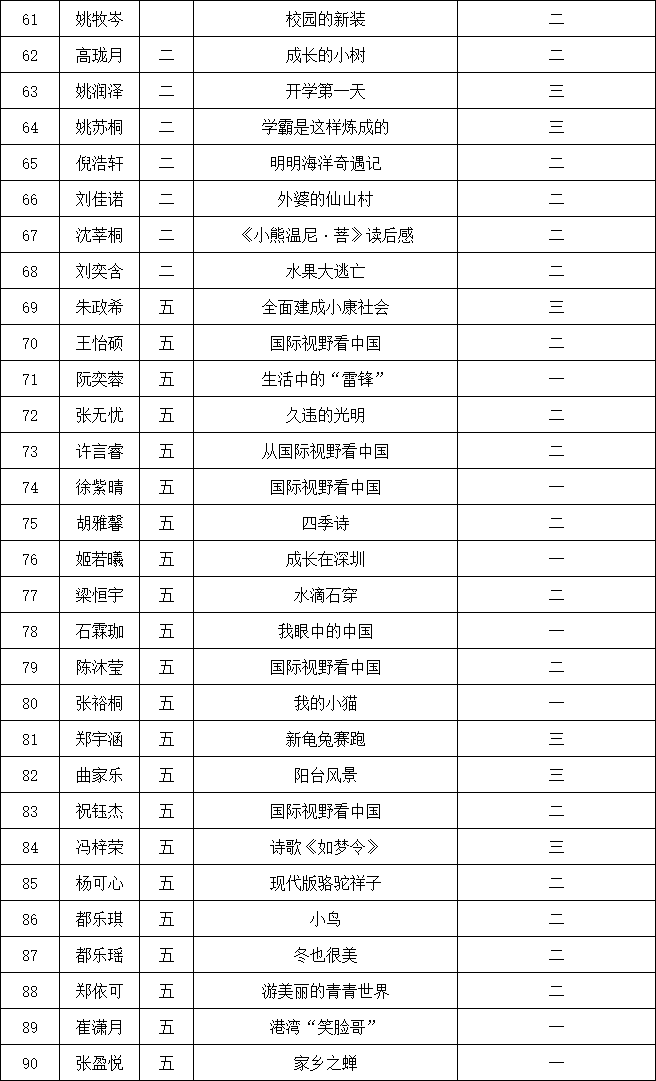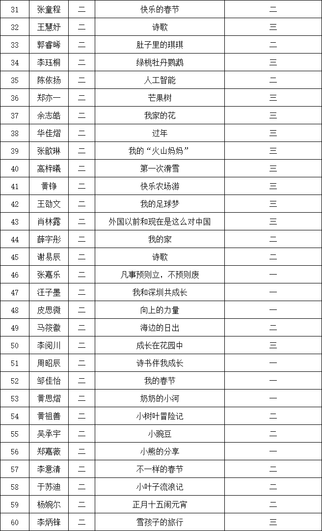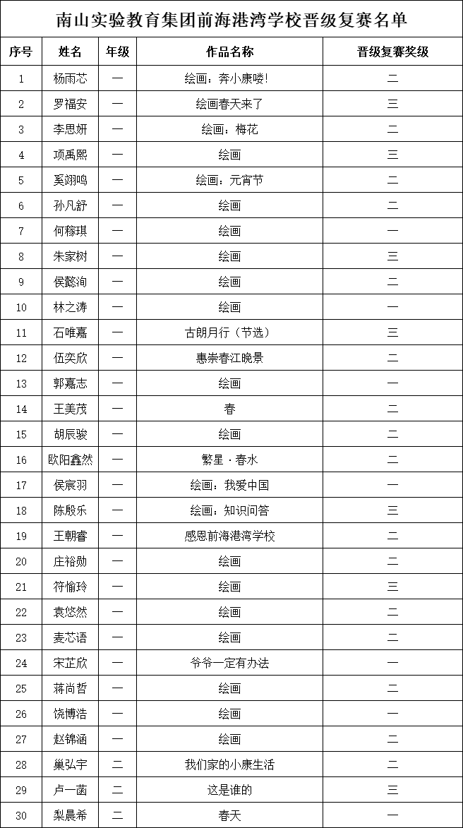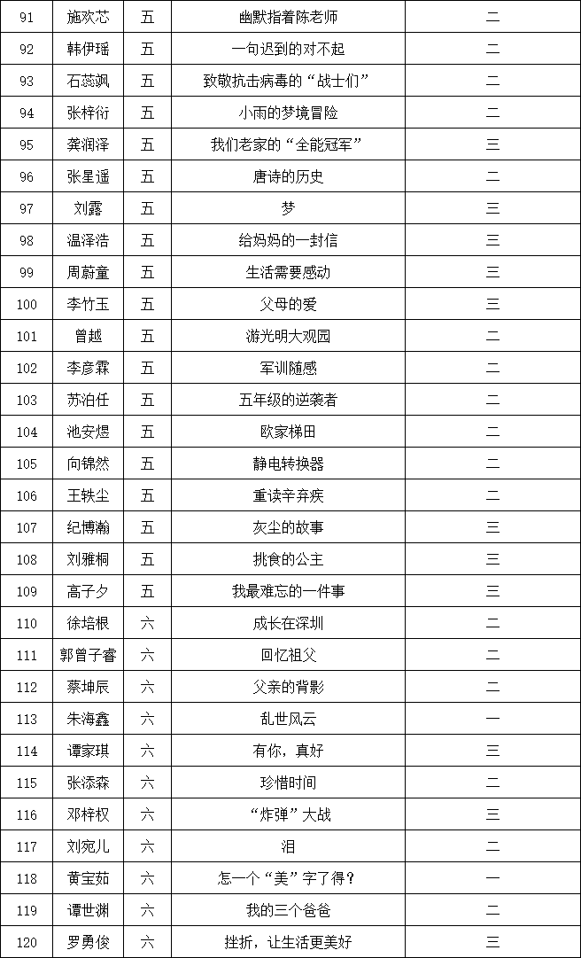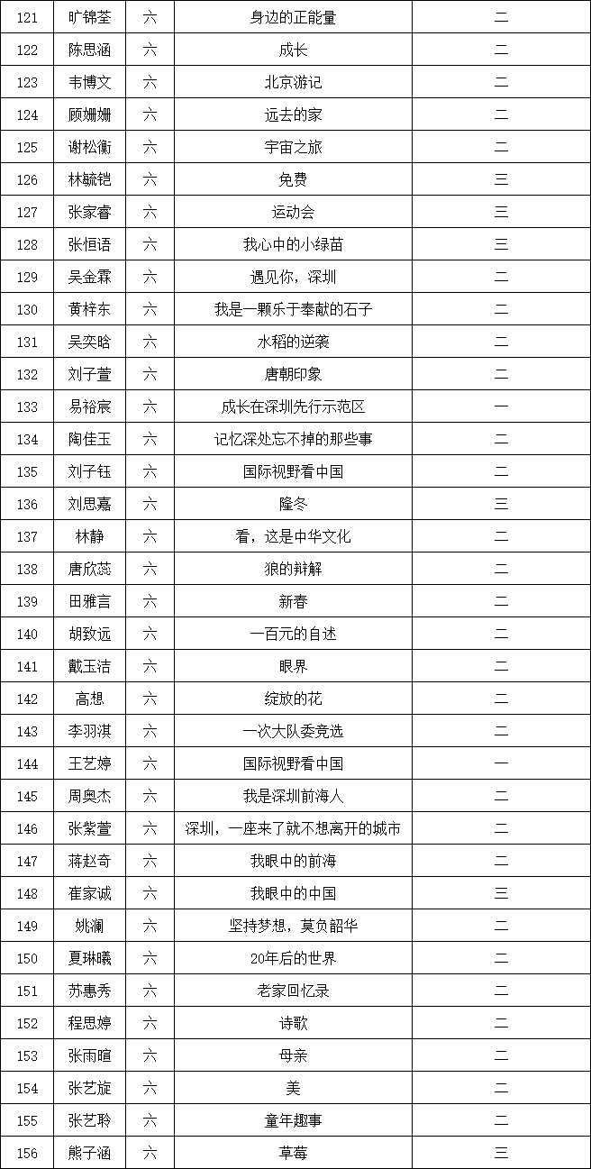 自2021年1月,活動(dòng)征稿啟動(dòng)以來,獲得了深圳市廣大中小學(xué)生、教師、文學(xué)愛好者的熱烈響應(yīng)積極參與,吸引了深圳百余所學(xué)校的上萬人關(guān)注報(bào)名?,F(xiàn)公布南山實(shí)驗(yàn)教育集團(tuán)前海港灣學(xué)校校園專場(chǎng)晉級(jí)復(fù)賽名單如下: