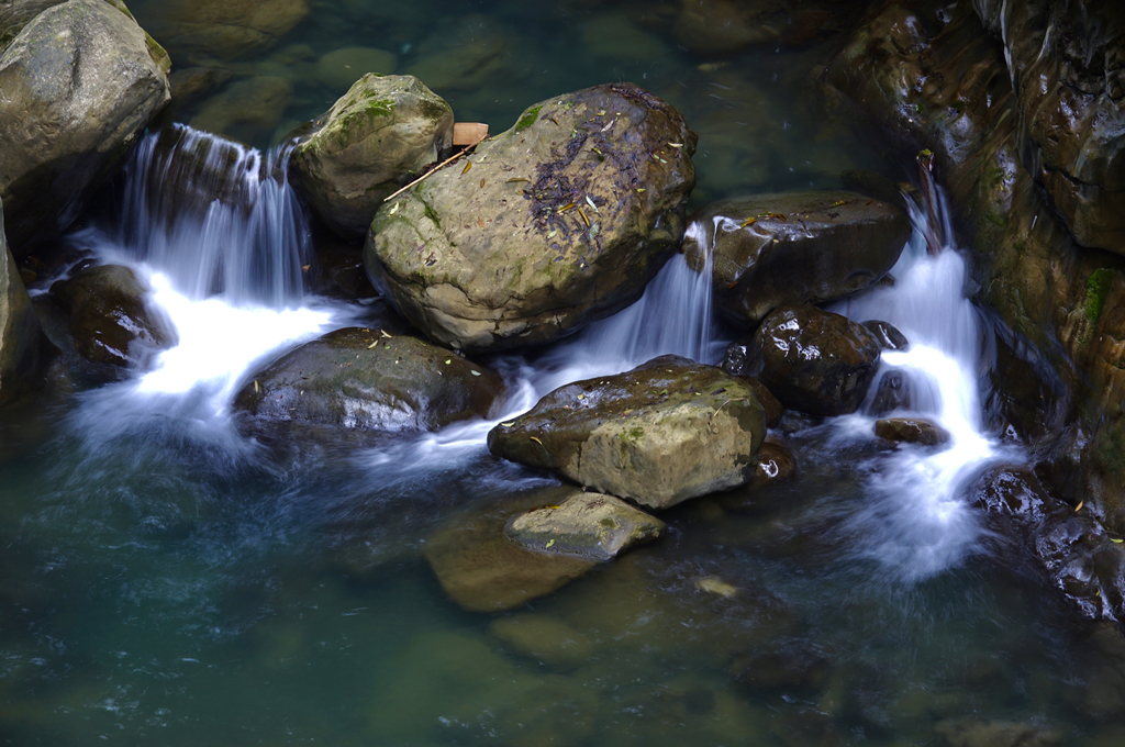 若從廊橋觀瀑底,鈣華體又酷似一只昂首“金龜”,在享受清瀑沐浴,即金龜戲瀑。特別是在太陽(yáng)照射下、瀑水飛濺,便可見(jiàn)地縫彩虹、鐵染谷底巖石呈橙紅色。李仁奇 攝