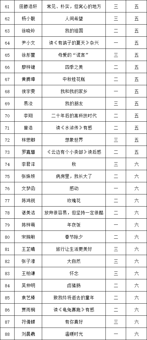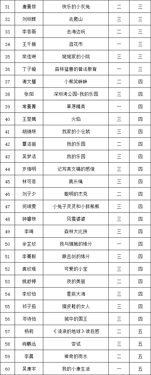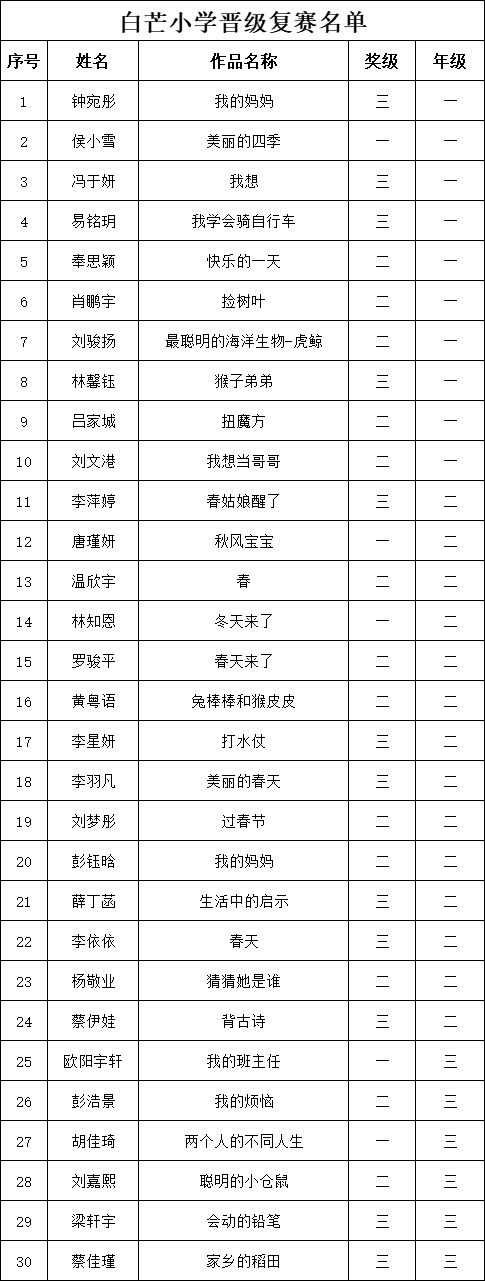 自2021年1月,活動(dòng)征稿啟動(dòng)以來(lái),獲得了深圳市廣大中小學(xué)生、教師、文學(xué)愛(ài)好者的熱烈響應(yīng)積極參與,吸引了深圳百余所學(xué)校的上萬(wàn)人關(guān)注報(bào)名?,F(xiàn)公布深圳市南山實(shí)驗(yàn)教育集團(tuán)白芒小學(xué)專場(chǎng)晉級(jí)復(fù)賽名單如下: