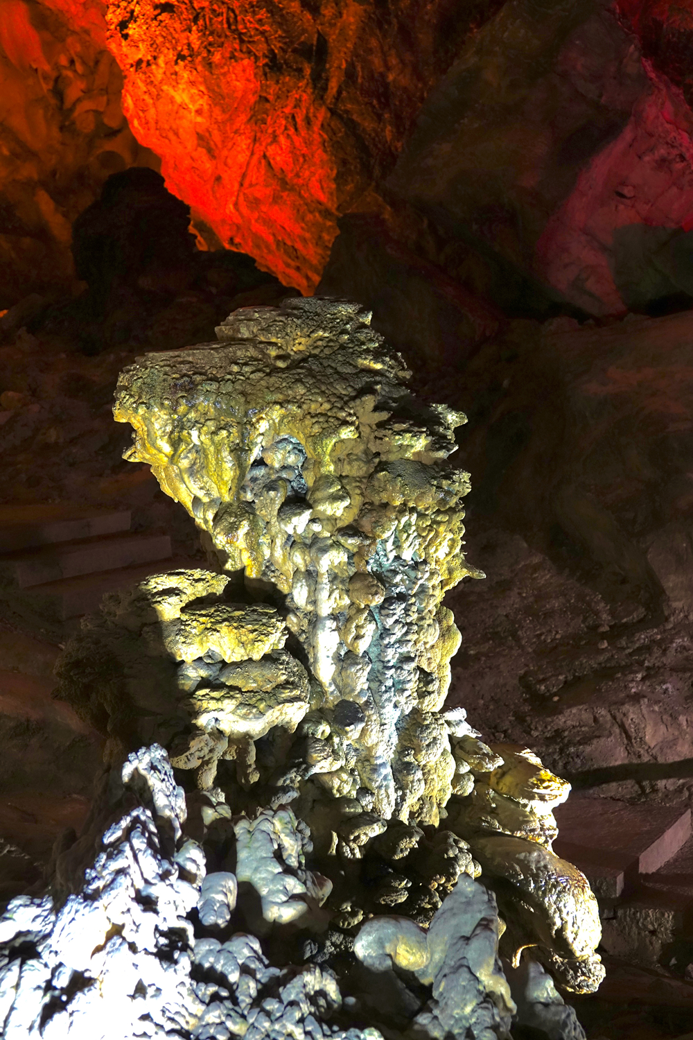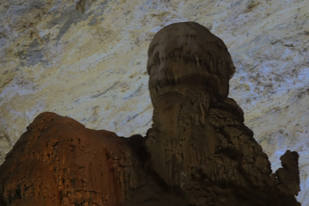 “霸王盔”,在一直徑3米多的圓形堆積物上又長出兩支并靠的戟形石筍,很像西楚霸王項(xiàng)羽所佩戴的頭盔。李仁奇 攝