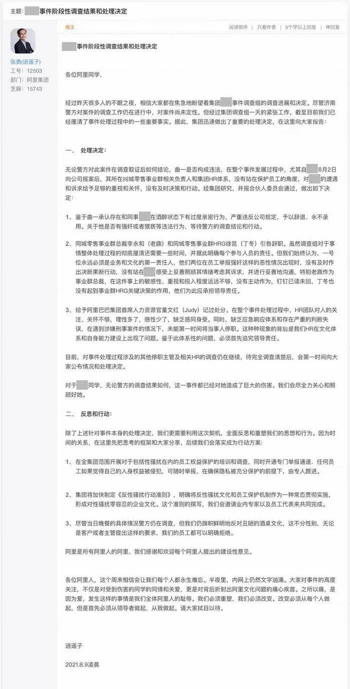 8月9日凌晨,阿里巴巴董事會主席兼CEO張勇在阿里內(nèi)網(wǎng)公布了“女員工被侵犯”的階段性內(nèi)部調(diào)查結(jié)果和處理決定。