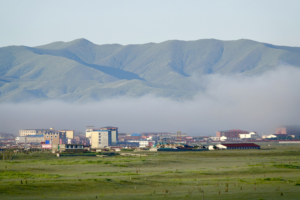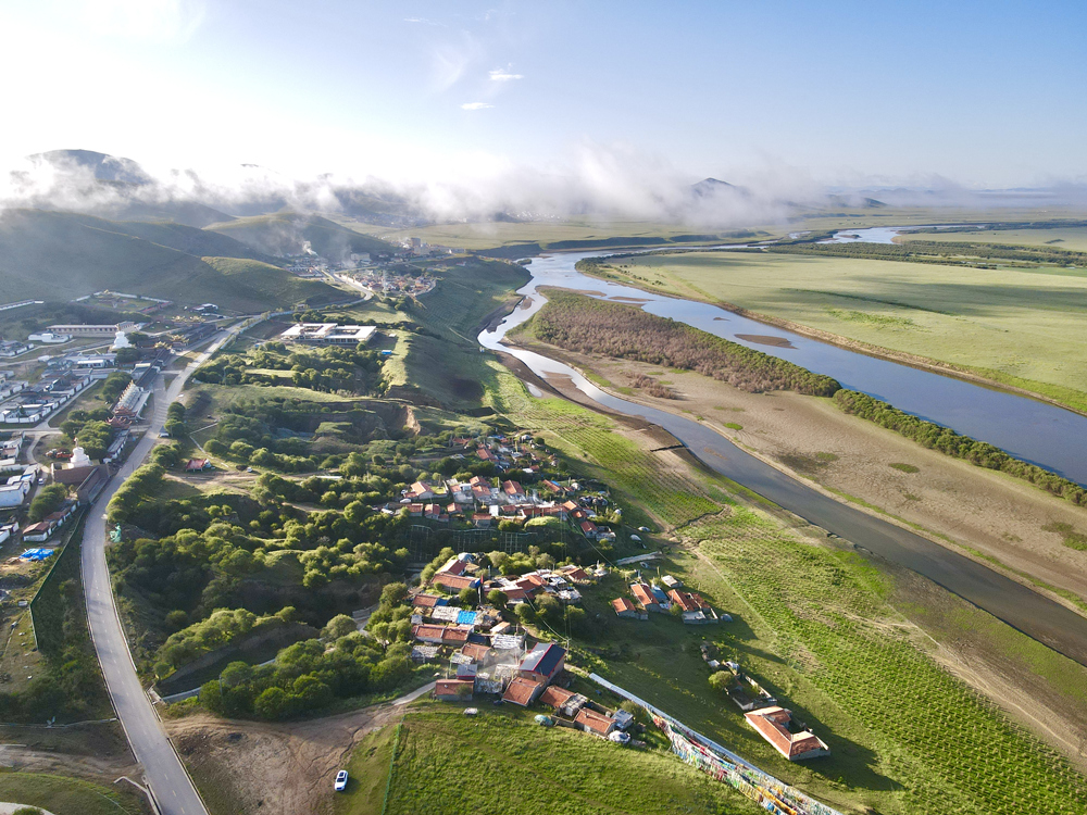 往白河方向遠眺,群山煙霧繚繞,如夢似幻;山下索克藏寺,沐浴晨光。航拍圖,郭國政 攝