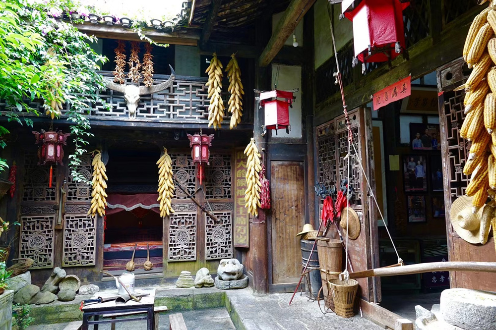 精致的四合院古色古香,陳列了土家人的生活用品:雕花門窗、雕花大床、石磨、背水的堰桶、背簍。李仁奇 攝