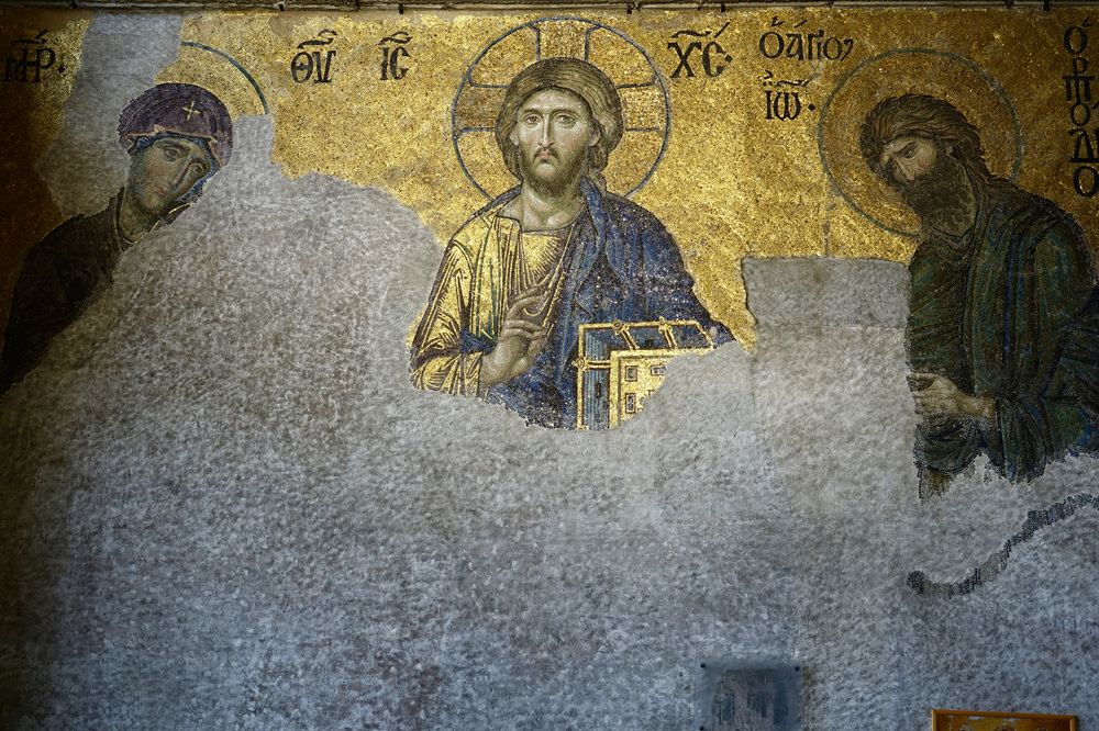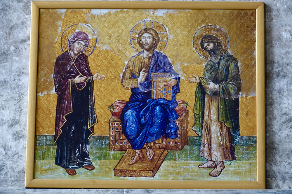 馬賽克《三圣像》,畫面下方已經(jīng)被嚴重損毀,但仍然能看到中央的耶穌基督,其兩側是圣母瑪利亞和施洗者約翰。李仁奇 攝