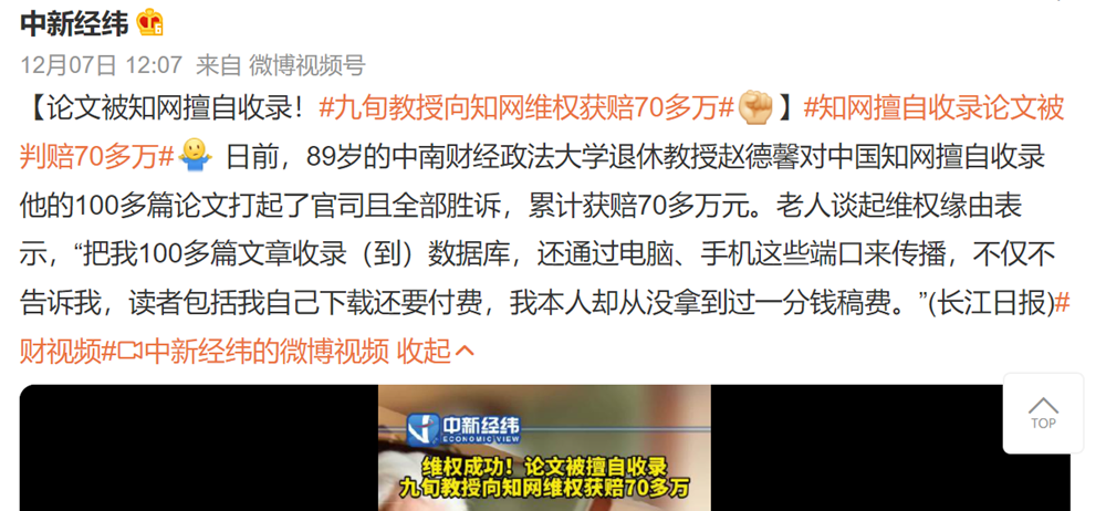 讀特客戶端·深圳新聞網(wǎng)2021年12月15日訊(記者 張玲 翁任瑩 見習(xí)記者 田剛)上百篇稿件被擅自錄入,一分錢稿費沒拿到。89歲退休法學(xué)教授趙德馨,從中國知網(wǎng)那里討回了自己160多篇稿件70多萬元元的收入,這是一種什么行為?這是目前已知第一個向中國知網(wǎng)維權(quán)成功的勝訴案例。
