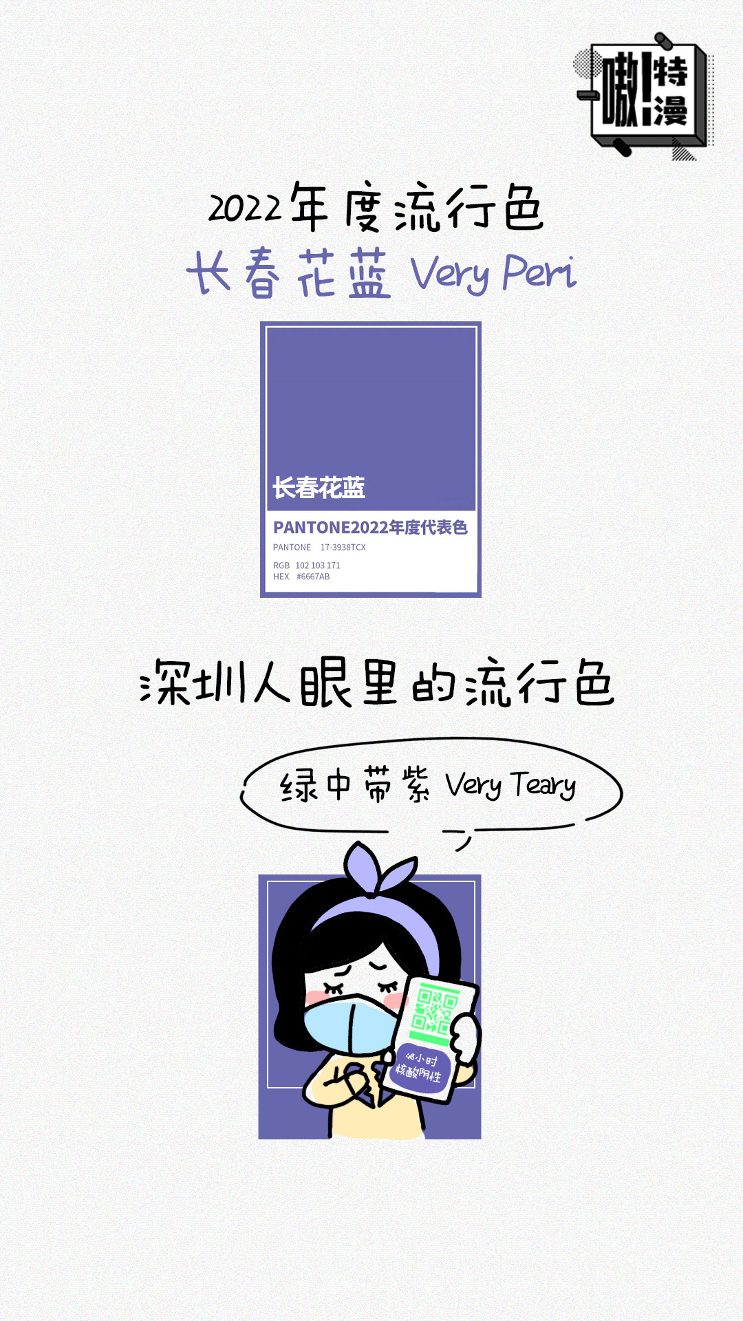 #嗷!特漫# 【#深圳人眼里的流行色是綠中帶紫# 】潘通(一家專門開發(fā)和研究色彩的權威機構)發(fā)布的2022年度流行色是名為very peri的長春花藍。而深圳人眼里的流行色則是綠中帶紫 Very Teary