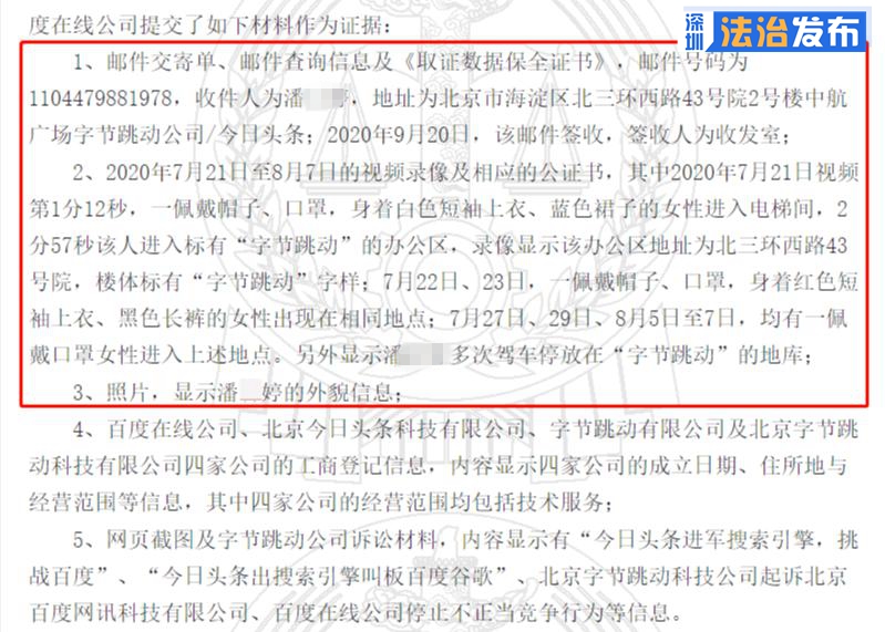 有一個(gè)細(xì)節(jié)值得注意:百度公司不僅向字節(jié)跳動(dòng)辦公地址寄去收件人為潘某某的快遞,而且向法庭提供了潘某某出現(xiàn)在字節(jié)跳動(dòng)辦公區(qū)、駕車停放在字節(jié)跳動(dòng)地庫(kù)等多個(gè)視頻錄像,這些舉動(dòng)被網(wǎng)友解讀為現(xiàn)實(shí)版諜戰(zhàn)大片。很多人從案件看到互聯(lián)網(wǎng)行業(yè)激烈的人才爭(zhēng)奪戰(zhàn)和同業(yè)競(jìng)爭(zhēng)的殘酷,也再次感受到競(jìng)業(yè)限制的威力。