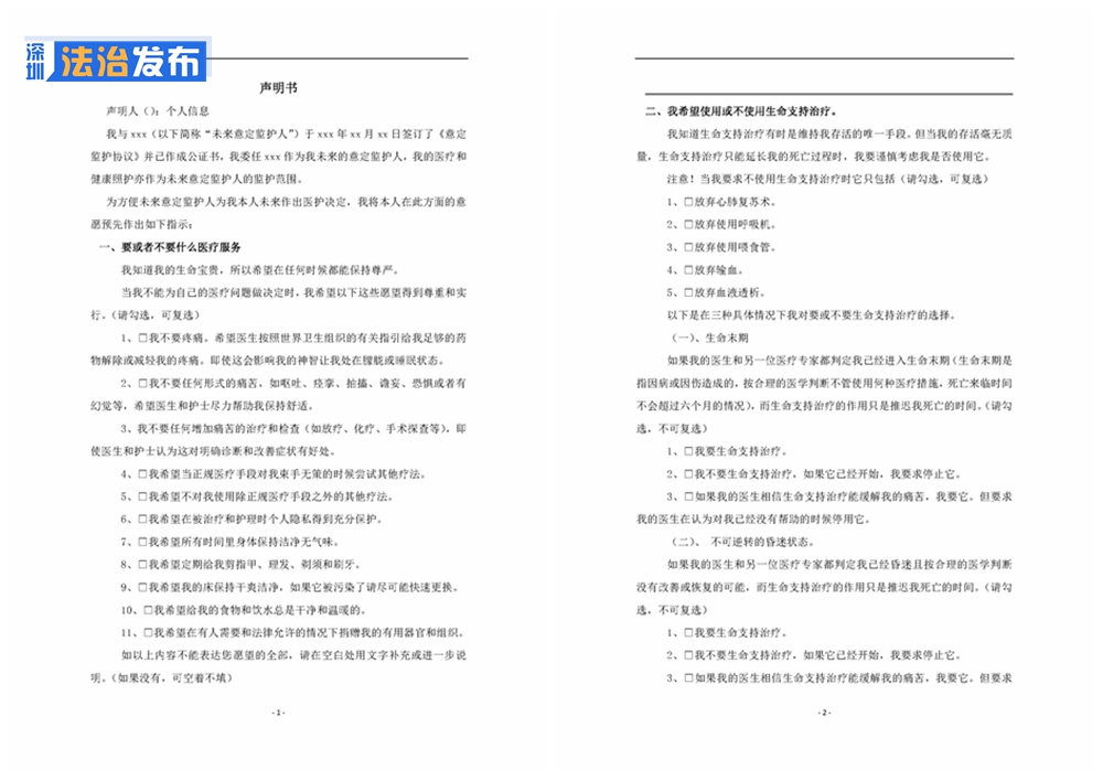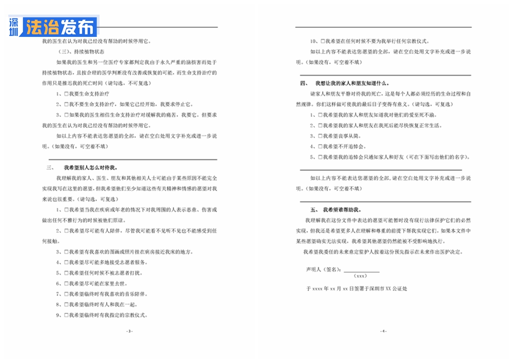 除了生前預(yù)囑的3種情況外,杜芹律師公證的這份聲明書,包含5個(gè)愿望清單①我要或不要什么醫(yī)療服務(wù)②我希望使用或者不使用生命支持治療③我希望別人怎么對待我④我想讓我的家人和朋友知道什么⑤我希望誰幫助我。