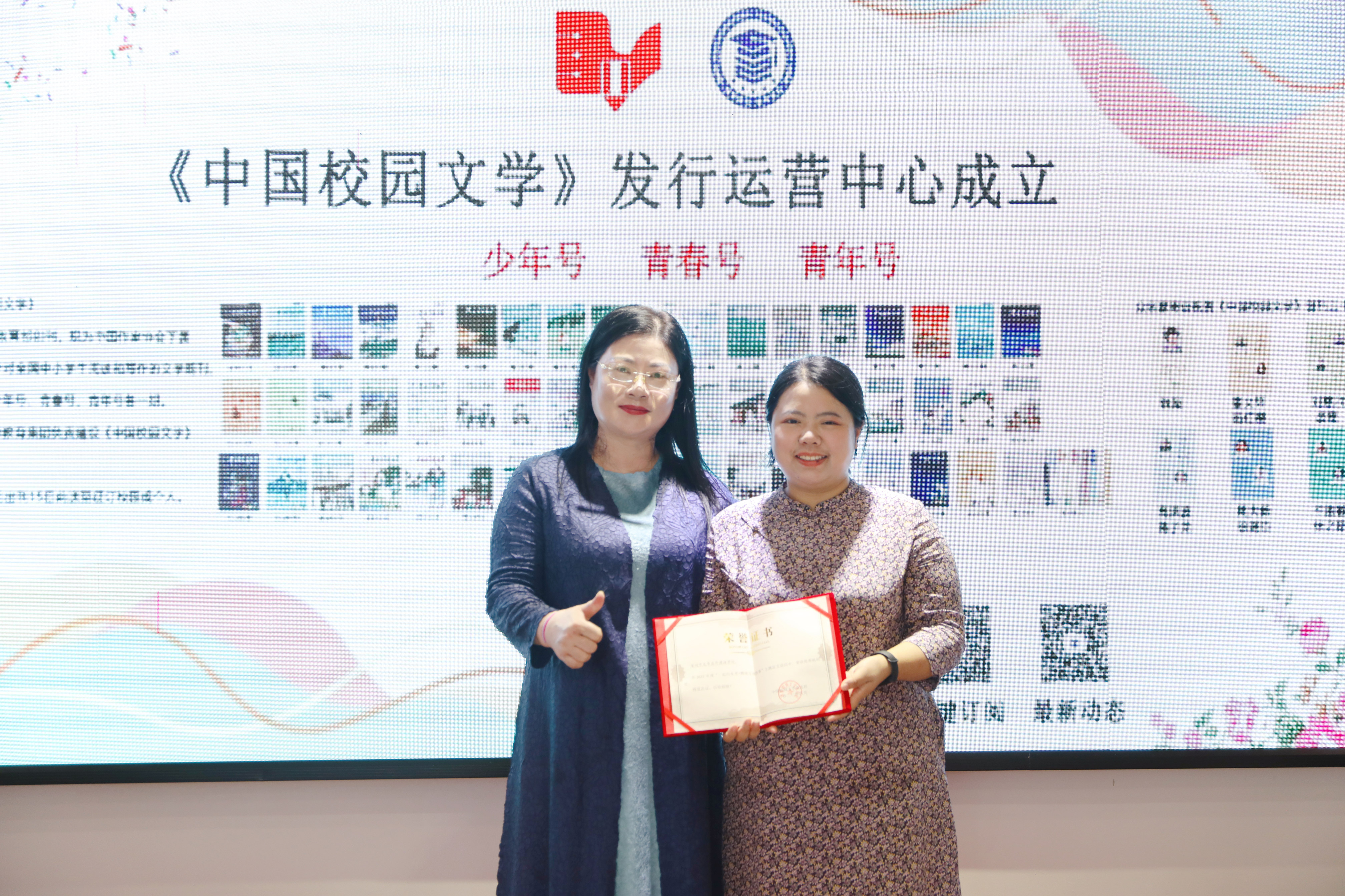 全國文學盛典聯(lián)合發(fā)起人、創(chuàng)始人肖硯寧為獲獎教師代表頒獎并合影