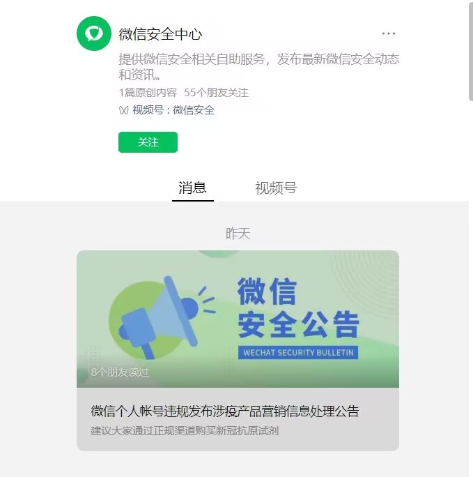公告強(qiáng)調(diào),“利用微信個(gè)人帳號(hào)發(fā)布抗原檢測試劑、藥品等營銷信息的行為,違反了相關(guān)法律法規(guī),也違反了《微信個(gè)人帳號(hào)使用規(guī)范》,微信安全團(tuán)隊(duì)將對違法違規(guī)行為進(jìn)行堅(jiān)決處理、嚴(yán)厲打擊。”