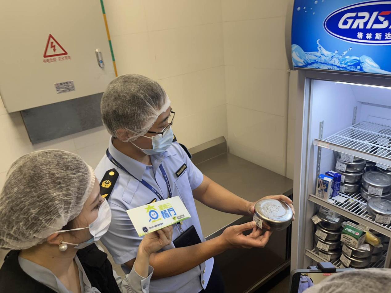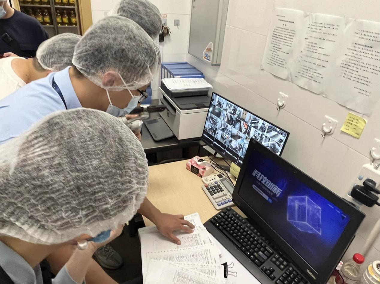 隨后,執(zhí)法人員一行進(jìn)入食堂后廚,對(duì)面點(diǎn)間、儲(chǔ)藏間、清洗區(qū)、冷凍庫(kù)等各分區(qū)進(jìn)行執(zhí)法檢查。經(jīng)查,后廚整體布局合理,其中食材存儲(chǔ)符合規(guī)定且日期均在保質(zhì)期內(nèi);留樣冰箱內(nèi)按規(guī)定保存了近期餐食樣品,留樣品名及時(shí)間標(biāo)注清晰,確保了來(lái)源可追溯;清洗區(qū)分區(qū)明確,刀具砧板按照顏色管理,有效避免了交叉感染。此外,在后廚辦公室,執(zhí)法人員查看了索證索票落實(shí)情況及日管控、周排查、月調(diào)度等相關(guān)制度管理資料,各類信息管理較完善。