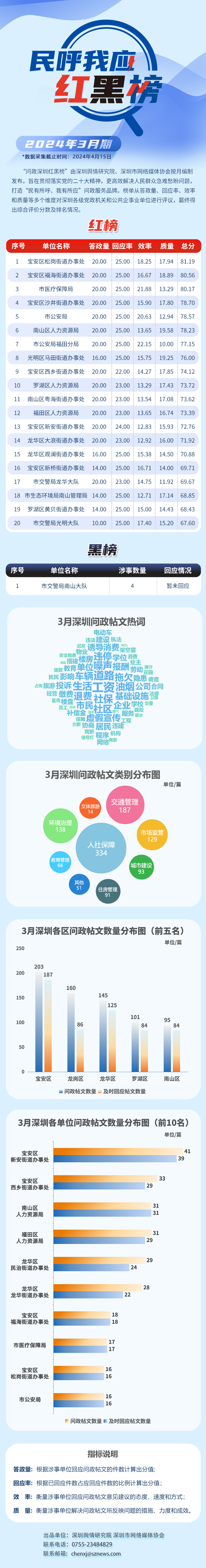 2024年3月,共有20家單位因積極開展網(wǎng)絡(luò)答政工作,贏得群眾的支持與認(rèn)可,最終登上“紅榜”,它們分別是:寶安區(qū)松崗街道辦事處、寶安區(qū)福海街道辦事處、市醫(yī)療保障局、寶安區(qū)沙井街道辦事處、市公安局、南山區(qū)人力資源局、市公安局福田分局、光明區(qū)馬田街道辦事處、寶安區(qū)西鄉(xiāng)街道辦事處、羅湖區(qū)人力資源局、南山區(qū)粵海街道辦事處、福田區(qū)人力資源局、寶安區(qū)新安街道辦事處、龍華區(qū)大浪街道辦事處、龍華區(qū)觀瀾街道辦事處、寶安區(qū)新橋街道辦事處、市交警局龍華大隊、市生態(tài)環(huán)境局南山管理局、羅湖區(qū)黃貝街道辦事處、市交警局光明大隊。另外,市交警局南山大隊因相關(guān)帖文回應(yīng)率偏低,整體答政效果不佳,被列入了“黑榜”。