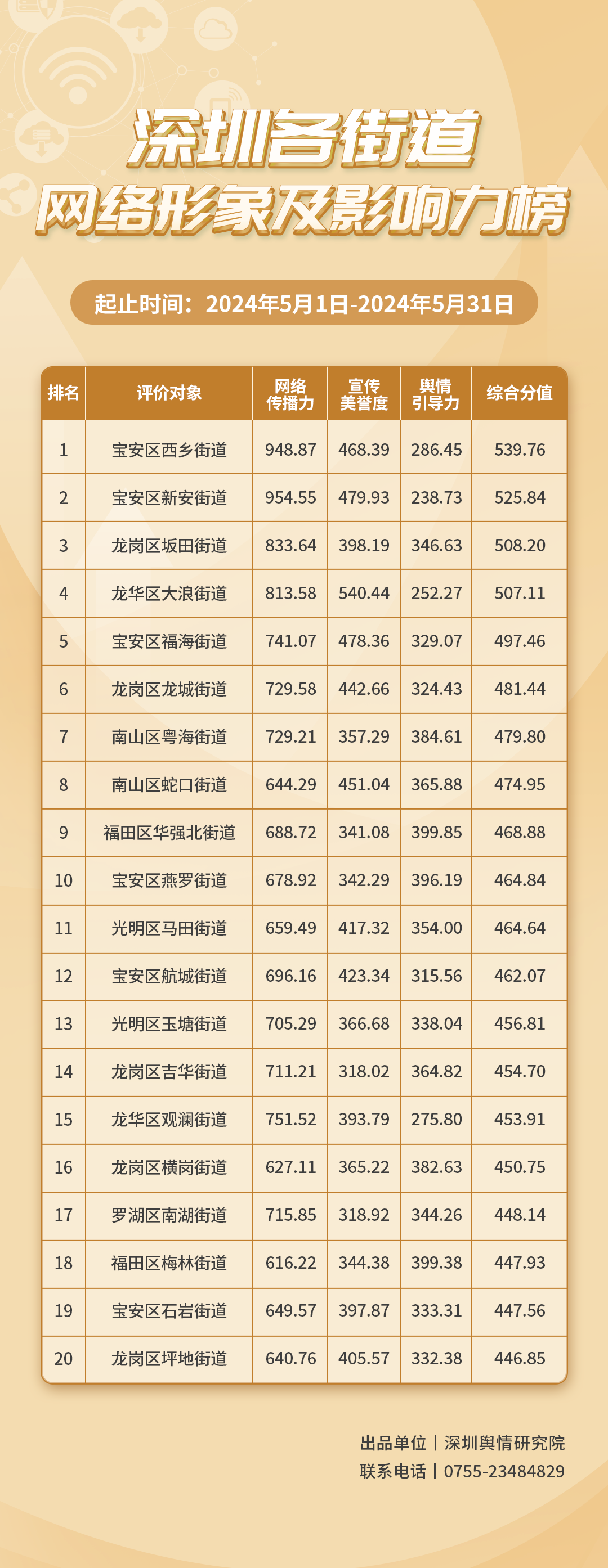 2024年5月,多街道線上線下同頻共振,努力建設“品質(zhì)街道”,積極打造“示范街道”,哪些街道表現(xiàn)較優(yōu)?讓我們通過《深圳各街道網(wǎng)絡形象及影響力榜》(5月榜單)一窺究竟。本期榜單數(shù)據(jù)統(tǒng)計范圍為2024年5月1日至5月31日。