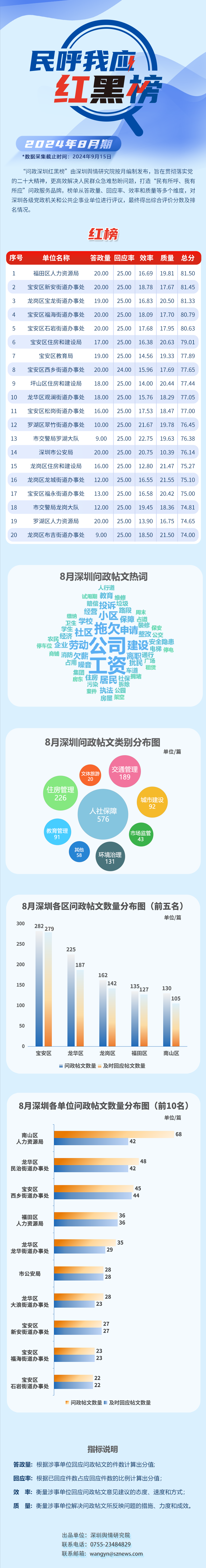 本期榜單采集的帖文主要來自深圳市及各區(qū)政府官網(wǎng)、深圳論壇、人民網(wǎng)領(lǐng)導(dǎo)留言板、深圳新聞網(wǎng)“民呼我應(yīng)”等平臺,所采集帖文發(fā)布時間為2024年8月1日至8月31日,采集截止時間為2024年9月15日。
