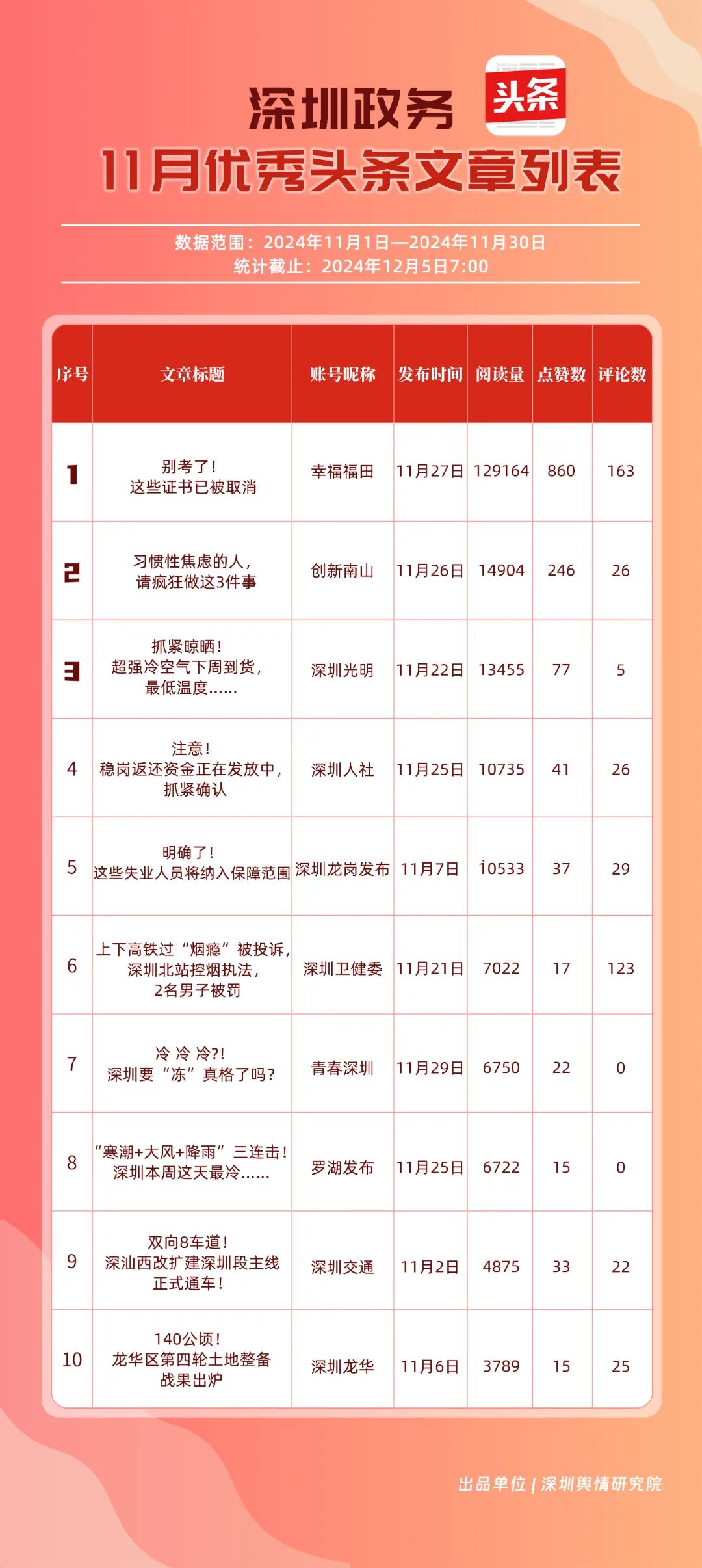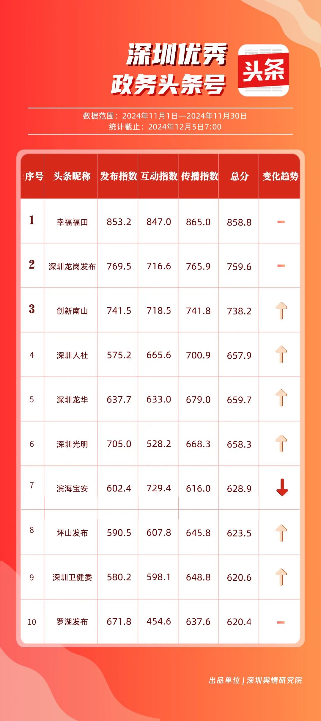 11月,“幸福福田”“深圳龍崗發(fā)布”“創(chuàng)新南山”“深圳人社”“深圳龍華”“深圳光明”“濱海寶安”“坪山發(fā)布”“深圳衛(wèi)健委”“羅湖發(fā)布”共10個政務頭條號入選“優(yōu)秀政務頭條號”榜單。“幸福福田”發(fā)布大量民生相關信息,穩(wěn)居第一?!吧钲邶垗彴l(fā)布”同樣表現(xiàn)不凡,排名始終位于前列,展現(xiàn)了其在信息傳播與政務服務方面的卓越能力。此外,賬號“創(chuàng)新南山”“深圳人社”“深圳龍華”“深圳光明”在榜單中的排名有所提升,為政務新媒體樹立了典范。