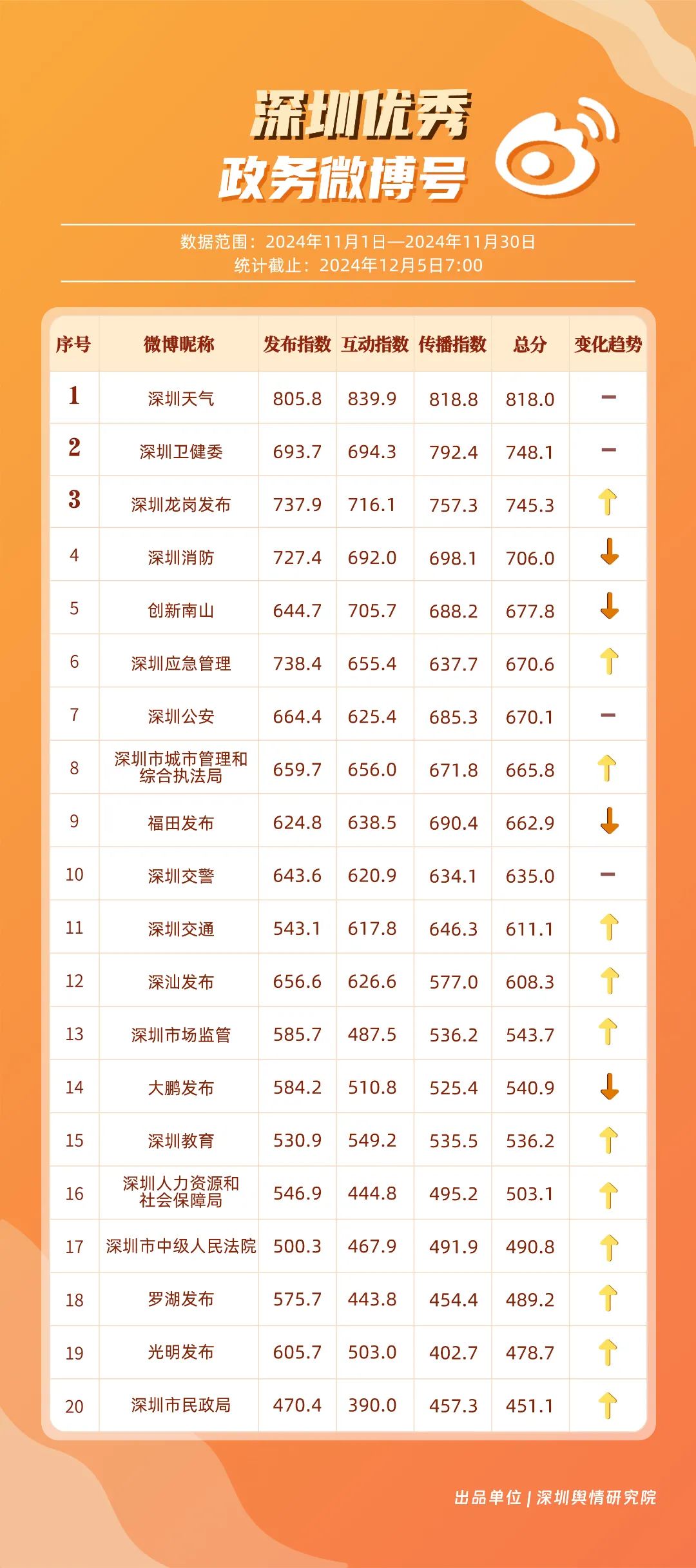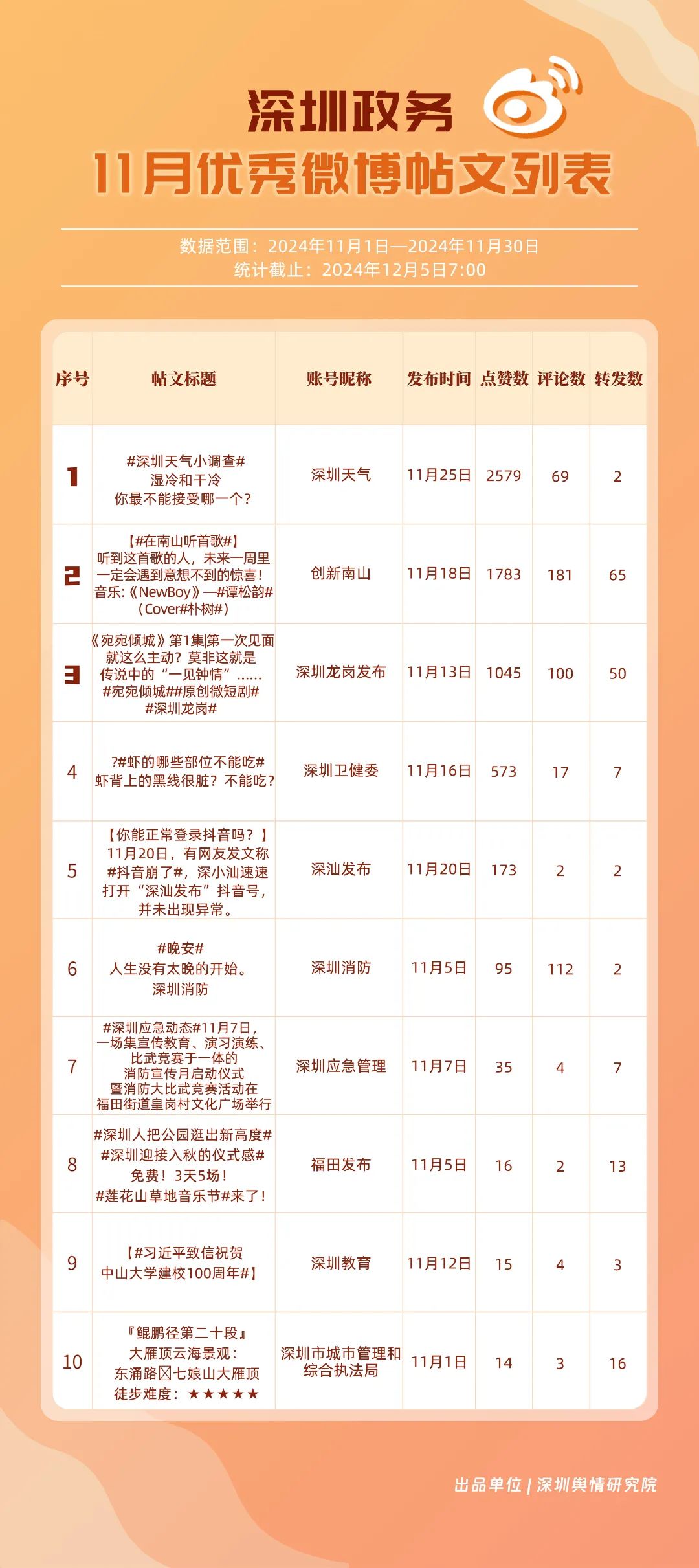 11月,“深圳天氣”“深圳衛(wèi)健委”“深圳龍崗發(fā)布”“深圳消防”“創(chuàng)新南山”“深圳應急管理”“深圳公安”“深圳市城市管理和綜合執(zhí)法局”“福田發(fā)布”“深圳交警”等20個賬號入選“優(yōu)秀政務微博號”?!吧钲谔鞖狻薄吧钲谛l(wèi)健委”賬號在信息傳播上不斷精進,為市民帶來及時、優(yōu)質且高效的資訊,內容緊貼民生,贏得了市民的廣泛贊譽,排名穩(wěn)定在前2名。同時,“深圳龍崗發(fā)布”“深圳消防”和“創(chuàng)新南山”等賬號也能夠精準滿足市民的信息需求,并在此基礎上提升市民閱讀體驗,推動了其在榜單上的穩(wěn)步提升,彰顯了政務微博的創(chuàng)新活力與社會價值。