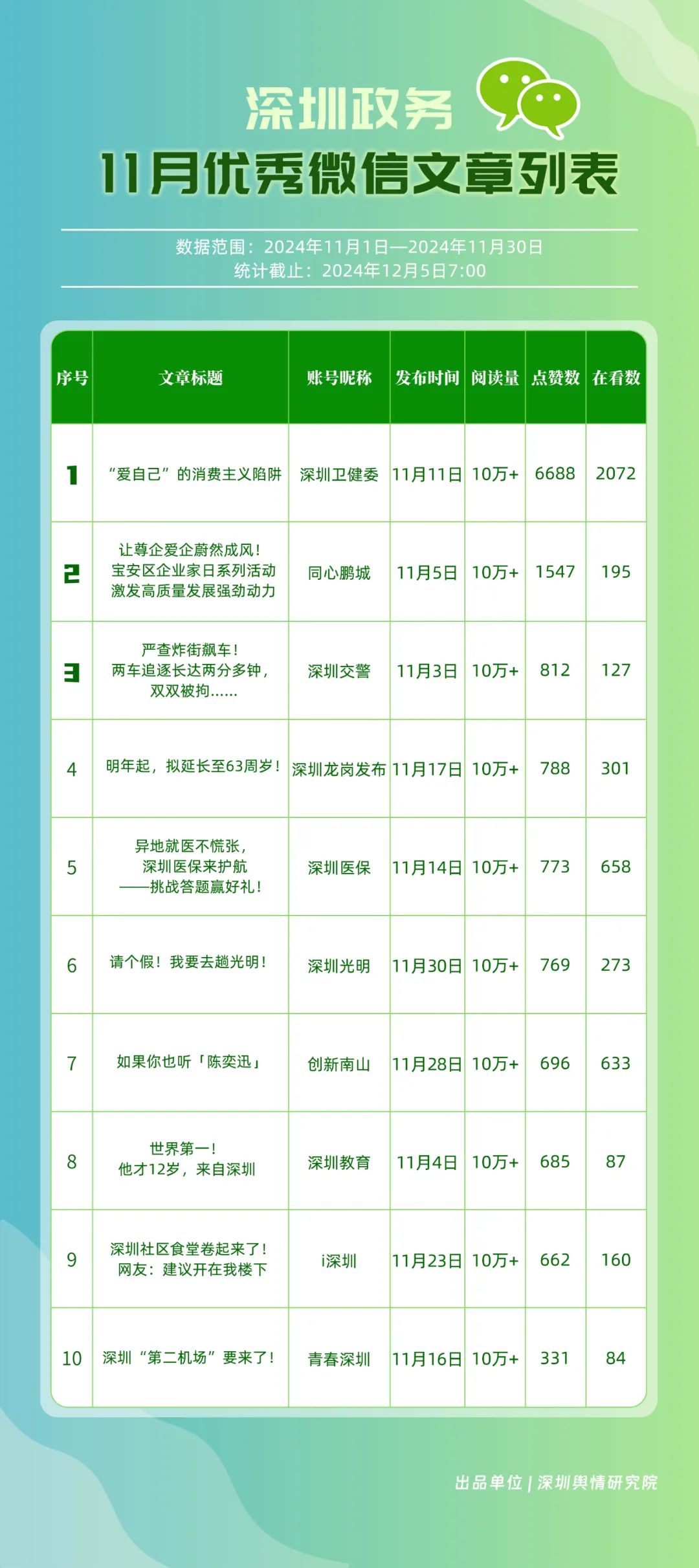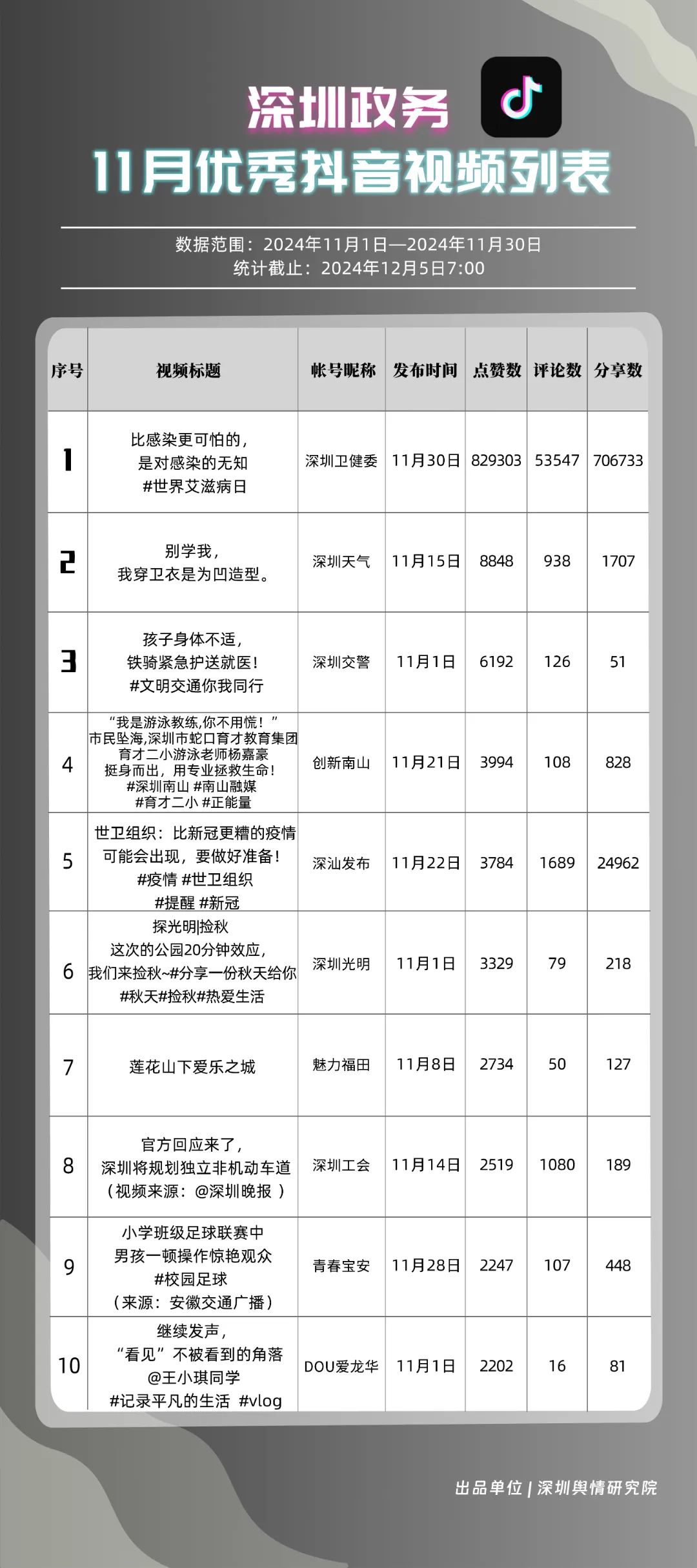 11月,獲“深圳優(yōu)秀政務微信視頻號”稱號的分別是“深汕視點”“青春深圳”“深圳衛(wèi)健委”“創(chuàng)新南山”“深圳龍崗發(fā)布”“福田融媒”“深圳教育”“深圳天氣”“深圳稅務”“深圳光明”。其中,“深汕視點”與“青春深圳”通過積極轉發(fā)涵蓋廣泛領域的優(yōu)質視頻內容,贏得了網民的廣泛點贊與推薦,彰顯了其在內容聚合與傳播上的獨到之處。“深圳衛(wèi)健委”則專注于衛(wèi)生健康領域,發(fā)布了一系列高質量的內容,深受網民喜愛,進一步鞏固了其在健康傳播領域的領先地位。