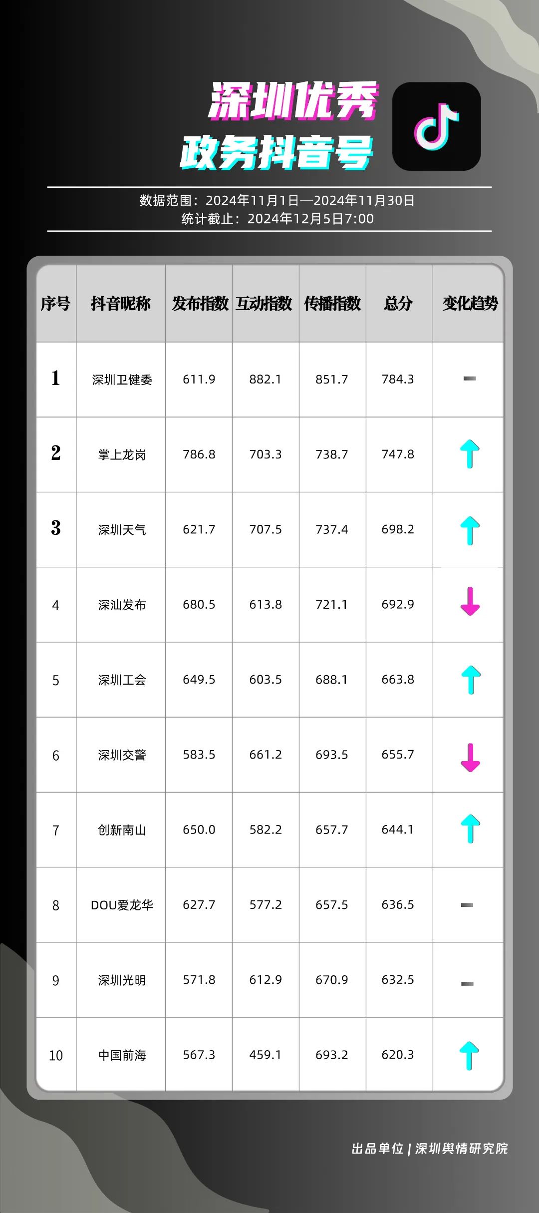 11月,市衛(wèi)生健康委、龍崗區(qū)、市氣象局、南山區(qū)、福田區(qū)、深汕特別合作區(qū)、市交通警察局、市應急管理局、光明區(qū)、龍華區(qū)榮登“深圳優(yōu)秀政務新媒體矩陣”榜單。11月,市衛(wèi)生健康委新媒體矩陣持續(xù)深耕衛(wèi)生健康領域,穩(wěn)固占據榜單首位。龍崗區(qū)新媒體矩陣則在多平臺發(fā)布《宛宛傾城》這一劇情類視頻,展現(xiàn)了其在內容創(chuàng)新上的積極探索。市氣象局新媒體矩陣則以多樣化的天氣播報形式,贏得了廣泛好評,位列榜單第三名。同時,南山區(qū)、福田區(qū)、深汕特別合作區(qū)等新媒體矩陣在各平臺展現(xiàn)出不凡實力,憑借各自優(yōu)勢與精彩的內容,在《深圳優(yōu)秀政務新媒體矩陣》榜單中取得靠前名次。
