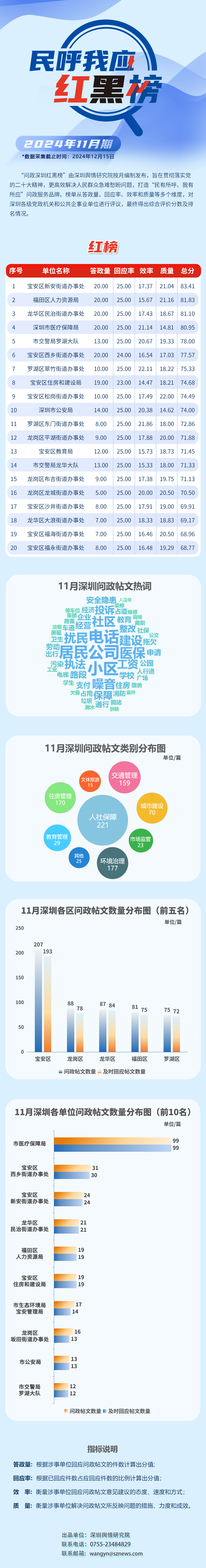 “深圳民呼我應(yīng)紅黑榜”由深圳輿情研究院按月編制發(fā)布,旨在貫徹落實黨的二十大精神,更高效解決人民群眾急難愁盼問題,打造“民有所呼、我有所應(yīng)”問政服務(wù)品牌。榜單從答政量、回應(yīng)率、效率和質(zhì)量等多個維度對深圳各級黨政機(jī)關(guān)和公共企事業(yè)單位進(jìn)行評議,最終得出綜合評價分?jǐn)?shù)及排名情況。