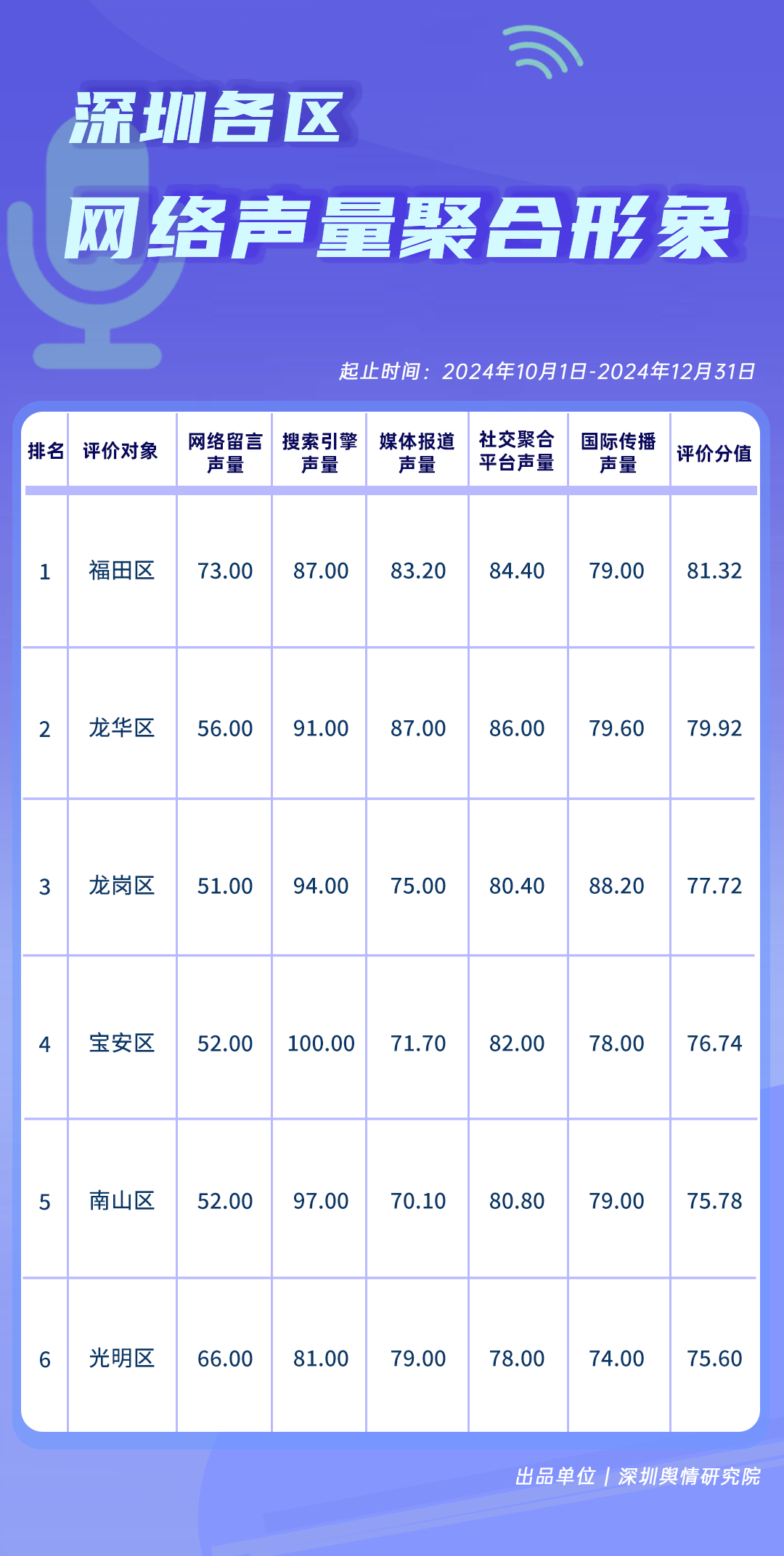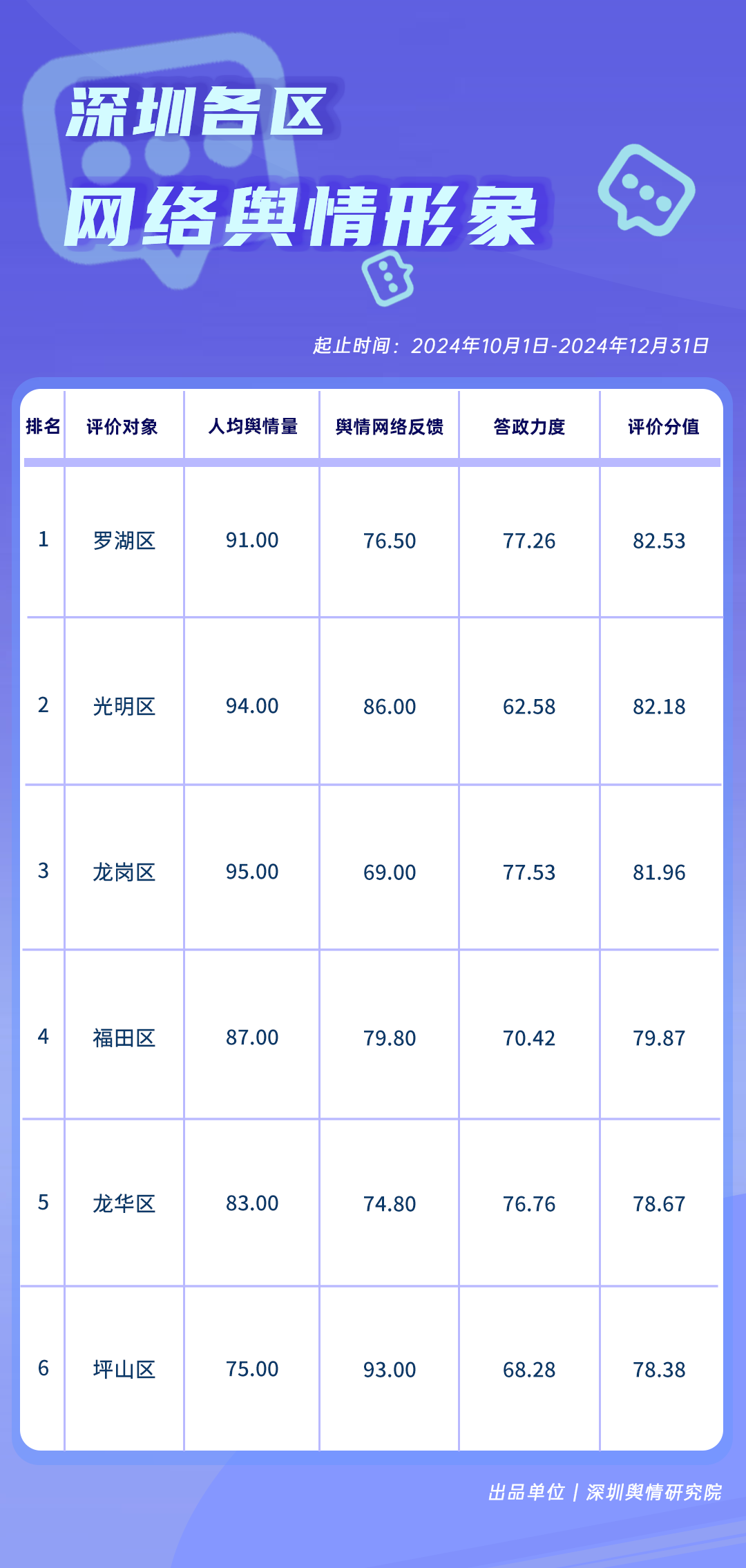 網(wǎng)絡(luò)輿情方面,羅湖區(qū)、光明區(qū)、龍崗區(qū)得分在80分以上,登上《深圳各區(qū)網(wǎng)絡(luò)輿情形象榜》前三名,福田區(qū)、龍華區(qū)、坪山區(qū)以超過75分的綜合評價分值上榜,體現(xiàn)出各區(qū)在維護良好網(wǎng)絡(luò)輿情生態(tài)、快速響應(yīng)網(wǎng)民關(guān)切等方面的積極態(tài)度。