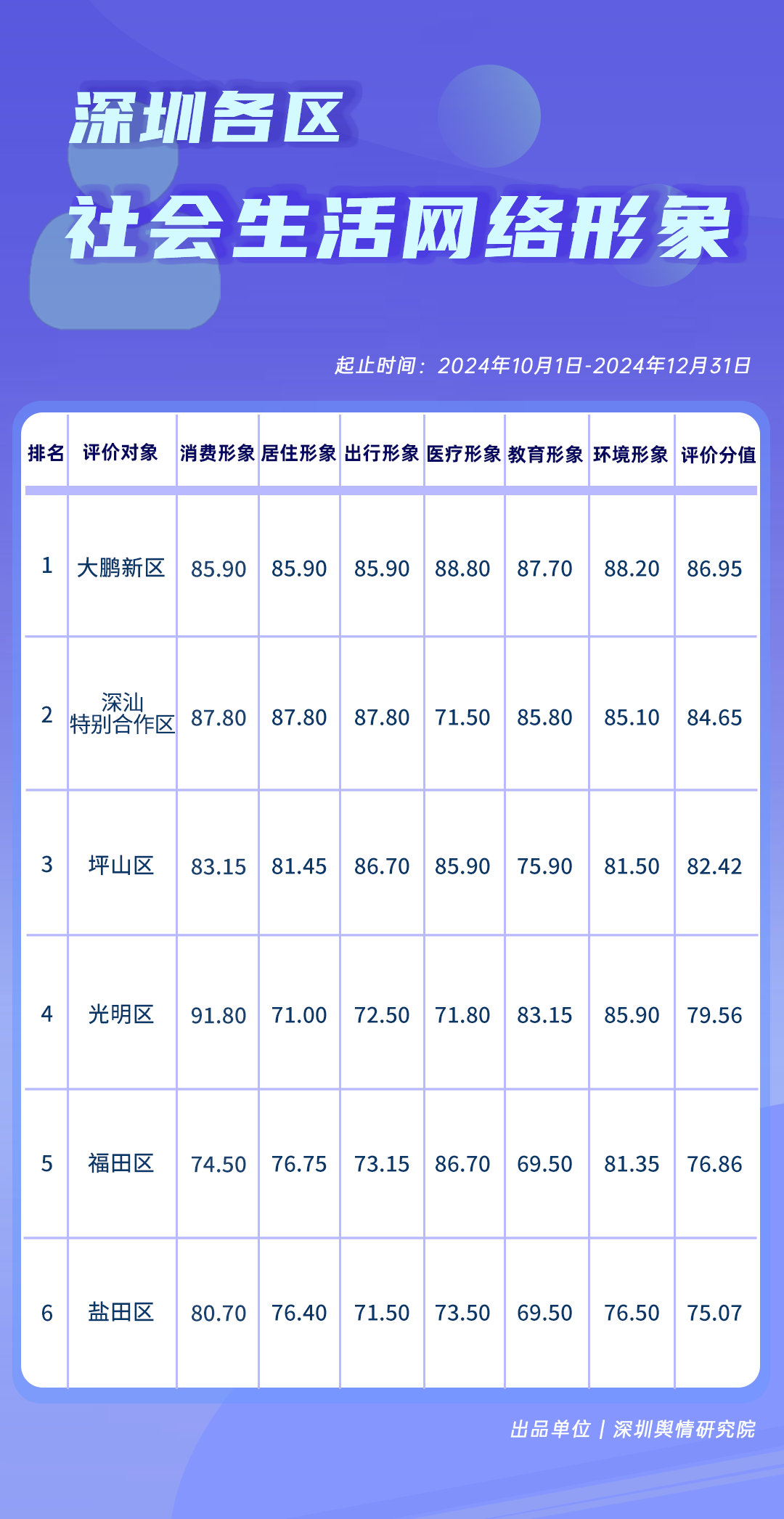 10-12月,《深圳各區(qū)社會生活網(wǎng)絡(luò)形象榜》中,大鵬新區(qū)、深汕特別合作區(qū)、坪山區(qū)綜合評價分值在80分以上,表現(xiàn)優(yōu)異。光明區(qū)、福田區(qū)、鹽田區(qū)各有所長,分別占據(jù)了榜單第四至第六的位置,成為深圳各區(qū)致力于改善社會民生、促進區(qū)域協(xié)調(diào)發(fā)展的生動范例。