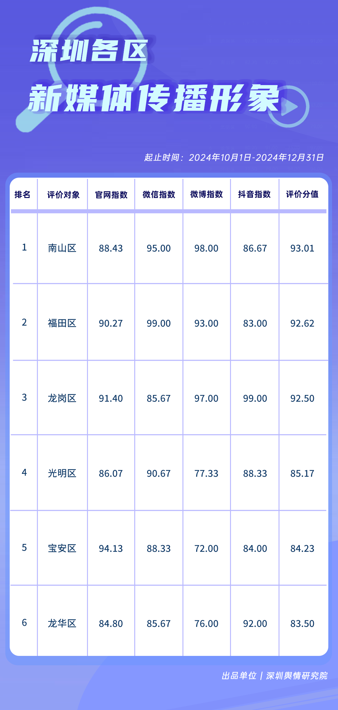 10-12月,福田區(qū)、龍崗區(qū)、光明區(qū)、龍華區(qū)、南山區(qū)、寶安區(qū)登上榜單前六。榜單中,福田區(qū)、龍崗區(qū)、光明區(qū)位列前三,綜合評價分值均在80分以上,居于榜單第四至第六名的龍華區(qū)、南山區(qū)、寶安區(qū)也在積極塑造網(wǎng)絡(luò)形象的道路上不斷邁進,展現(xiàn)了各區(qū)在網(wǎng)絡(luò)形象建設(shè)領(lǐng)域的蓬勃活力與持續(xù)努力。