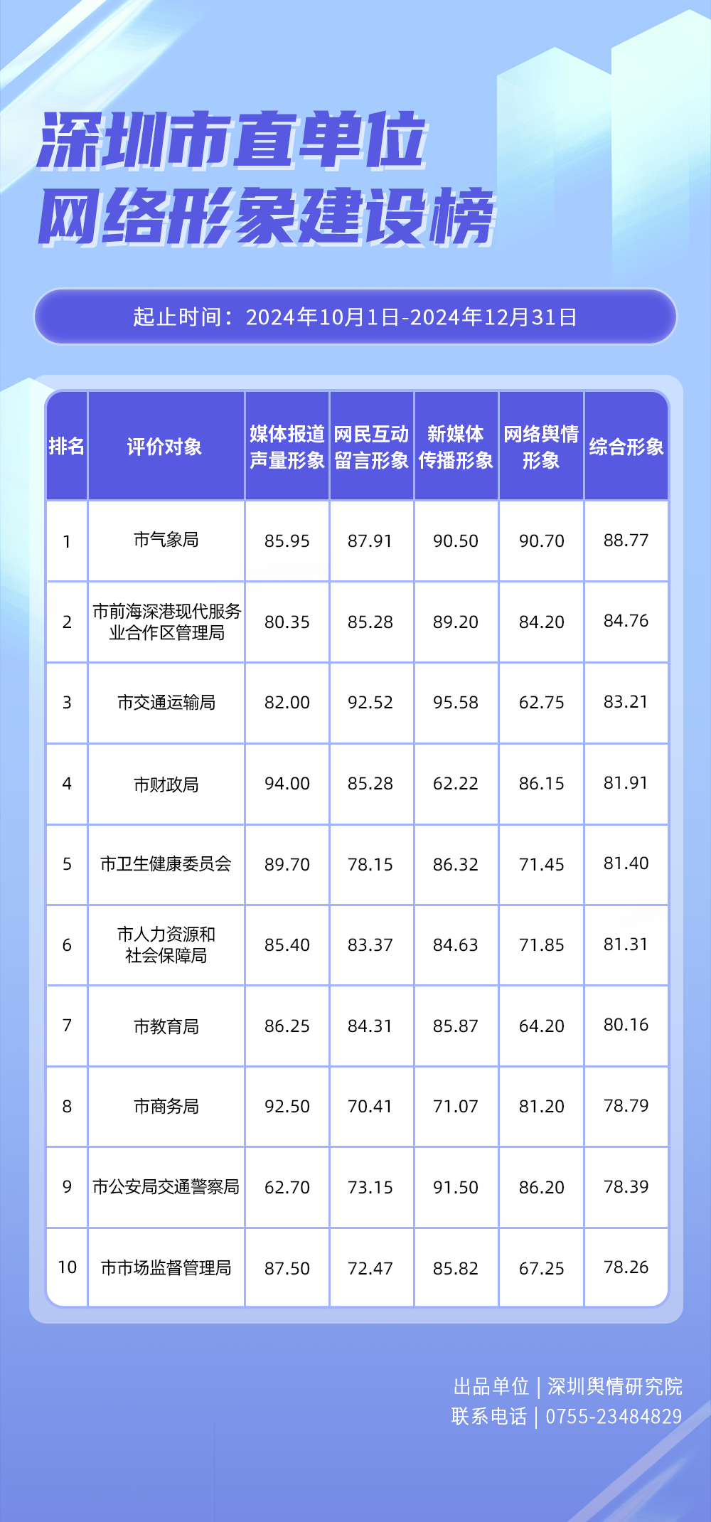 10-12月,市氣象局、市前海深港現(xiàn)代服務(wù)業(yè)合作區(qū)管理局、市交通運輸局、市財政局、市衛(wèi)生健康委員會、市人力資源和社會保障局、市教育局、市商務(wù)局、市公安局交通警察局、市市場監(jiān)督管理局在網(wǎng)絡(luò)形象建設(shè)工作方面表現(xiàn)相對突出,登上《深圳市直單位網(wǎng)絡(luò)形象建設(shè)榜》。其中,市氣象局、市前海深港現(xiàn)代服務(wù)業(yè)合作區(qū)管理局、市交通運輸局憑借其卓越的網(wǎng)絡(luò)形象建設(shè)工作,成功躋身前列,體現(xiàn)出高水平的網(wǎng)絡(luò)形象管理能力,展現(xiàn)了市直單位在新媒體時代下的責任與擔當,為構(gòu)建和諧社會環(huán)境貢獻了積極力量。