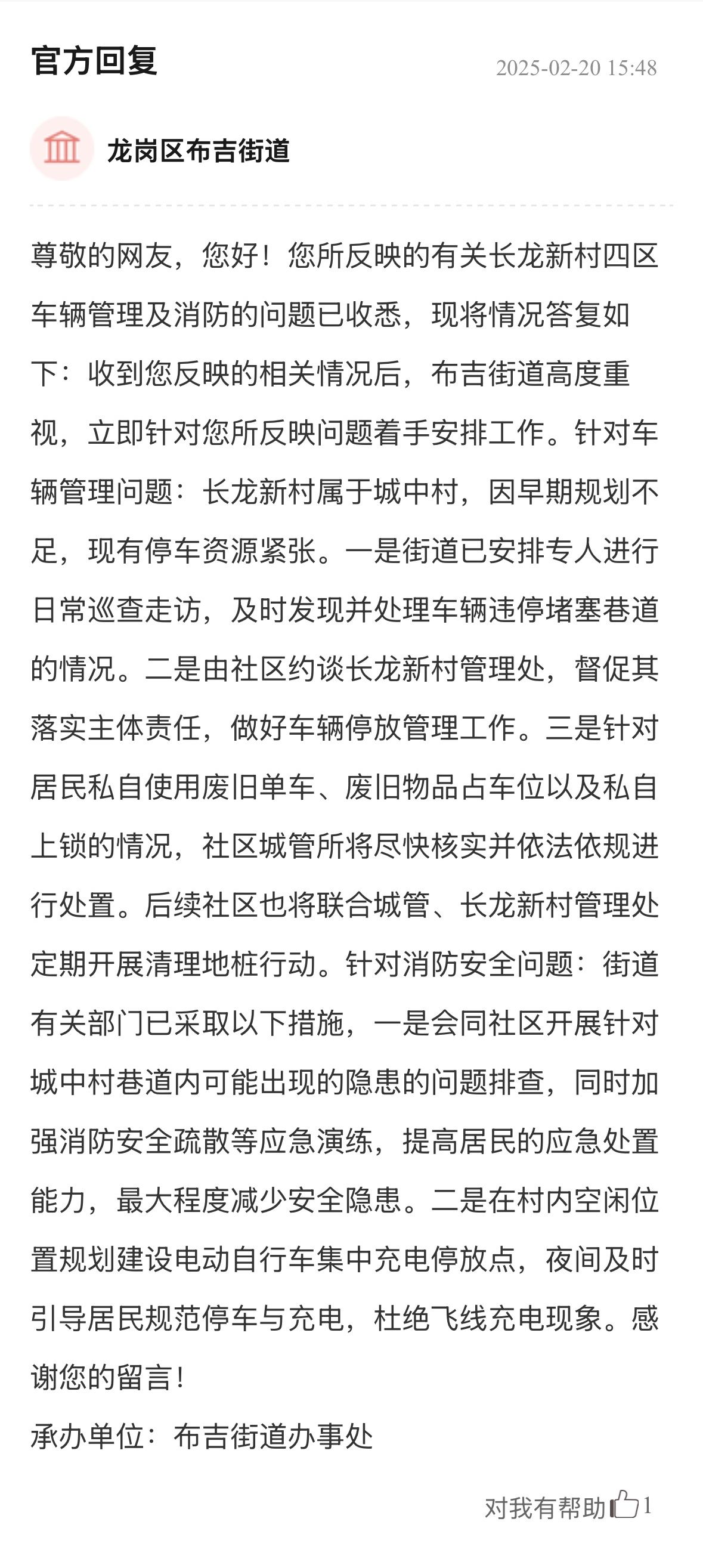 案例點(diǎn)評(píng):街道辦針對(duì)車輛管理、消防問題多管齊下,旨在營造一個(gè)通暢、安全的出行和生活環(huán)境,態(tài)度值得肯定?;貞?yīng)展示了街道辦構(gòu)建的“專項(xiàng)巡查+設(shè)施建設(shè)+行為引導(dǎo)”綜合治理體系,精準(zhǔn)直擊問題核心,兼顧當(dāng)下整治與長(zhǎng)遠(yuǎn)規(guī)劃,切實(shí)保障居民居住和生活安全,其系統(tǒng)性解決思路對(duì)同類區(qū)域治理具有重要參考價(jià)值。