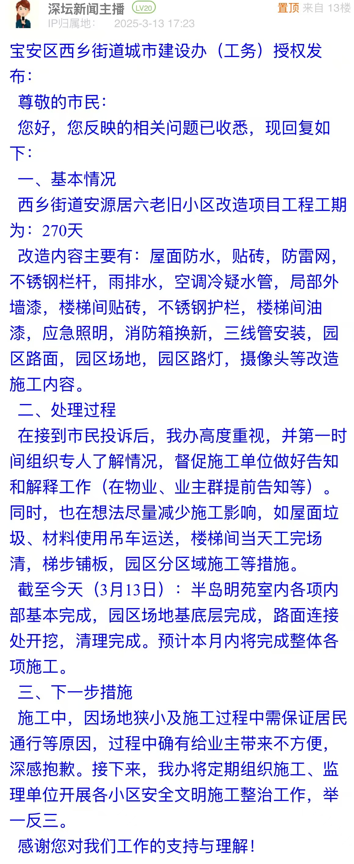 有市民反映寶安區(qū)一小區(qū)舊改過程中,施工單位無人監(jiān)管、施工無計(jì)劃、物業(yè)單位不作為、未做到文明施工