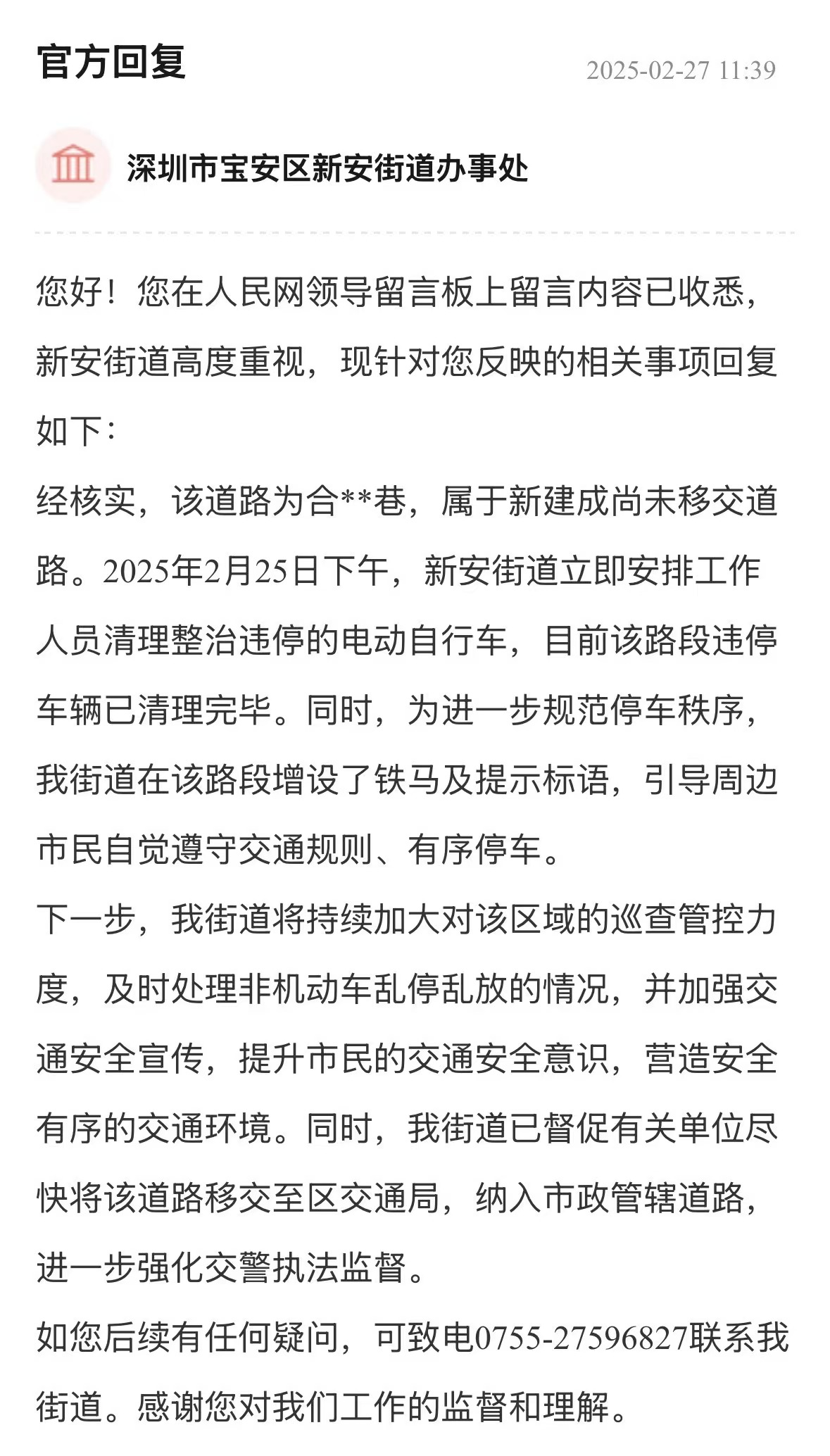 案例點(diǎn)評(píng):非機(jī)動(dòng)車亂停放影響交通和消防安全,嚴(yán)重影響市民生活。街道辦行動(dòng)迅速,第一時(shí)間清理違停車輛,增設(shè)鐵馬及提示標(biāo)語,規(guī)范停車秩序,展現(xiàn)了高效的處置能力。回應(yīng)中,街道還制定了長(zhǎng)效治理計(jì)劃,構(gòu)建“短期整治+長(zhǎng)效管理”模式,有助于解決區(qū)域交通問題,提升城市管理水平。