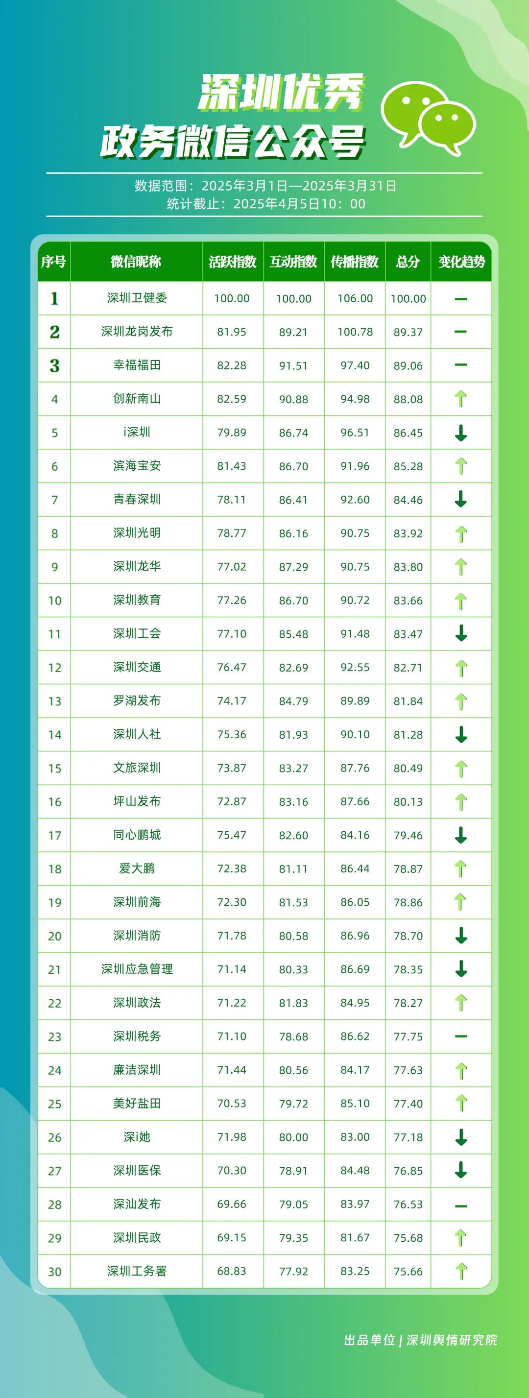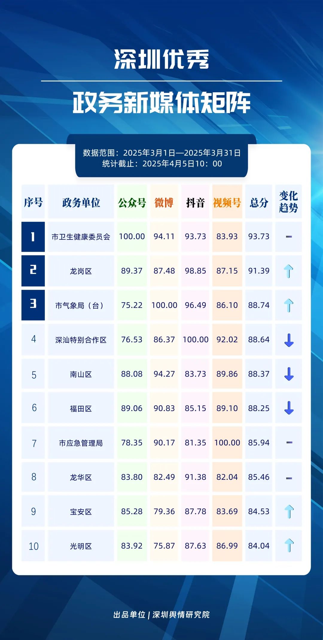 3月,市衛(wèi)生健康委、龍崗區(qū)、市氣象局、深汕特別合作區(qū)、南山區(qū)、福田區(qū)、市應(yīng)急管理局、龍華區(qū)、寶安區(qū)、光明區(qū)榮登“深圳優(yōu)秀政務(wù)新媒體矩陣”榜單。3月,市衛(wèi)生健康委新媒體矩陣持續(xù)關(guān)注市民身心健康,發(fā)布健康科普內(nèi)容,穩(wěn)居榜單第一位;龍崗區(qū)新媒體矩陣在抖音、微信視頻號(hào)平臺(tái)發(fā)力宣傳,躍居榜單第二位;市氣象局新媒體矩陣在微博平臺(tái)連續(xù)多期獲得滿分,持續(xù)以氣象預(yù)警與生活指南結(jié)合的內(nèi)容模式,為市民帶來便利信息。以上賬號(hào)在“深圳優(yōu)秀政務(wù)新媒體矩陣”榜單中榮獲前三名。此外,深汕特別合作區(qū)新媒體矩陣積極發(fā)布網(wǎng)絡(luò)熱點(diǎn)內(nèi)容,收獲較多網(wǎng)民關(guān)注分享;南山區(qū)新媒體矩陣多平臺(tái)實(shí)力強(qiáng)勁,以88.37分居于榜單第五位。值得關(guān)注的是,寶安區(qū)新媒體矩陣時(shí)隔多期躋身榜單前十名,多平臺(tái)均衡發(fā)展成效初顯。