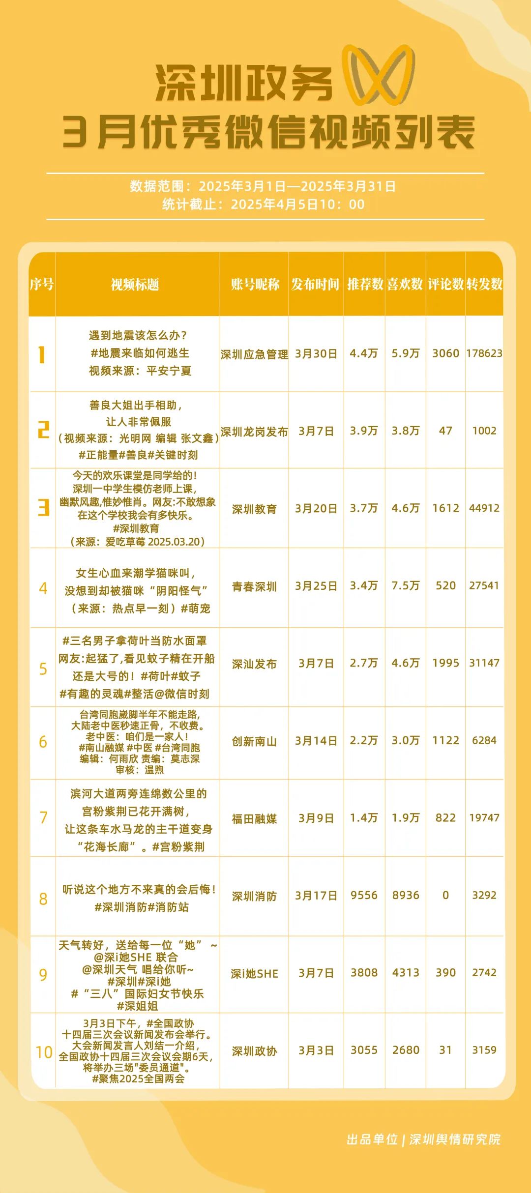 3月,獲“深圳優(yōu)秀政務(wù)微信視頻號(hào)”稱號(hào)的分別是“深圳應(yīng)急管理”“深圳教育”“深汕發(fā)布”“青春深圳”“創(chuàng)新南山”“福田融媒”“深圳龍崗發(fā)布”“深圳光明”“文旅深圳”“深圳天氣”。其中,“深圳應(yīng)急管理”以20余篇作品收獲超20萬次轉(zhuǎn)發(fā),躍居第一名,一期有關(guān)“地震來臨如何逃生”的視頻收獲超17萬次轉(zhuǎn)發(fā),展現(xiàn)了其內(nèi)容的高實(shí)用性?!吧钲诮逃薄吧钌前l(fā)布”位于榜單第二、三位,總分超90分,反映出兩賬號(hào)在民生教育、區(qū)域宣傳領(lǐng)域擁有較好傳播效果?!扒啻荷钲凇薄皠?chuàng)新南山”“福田融媒”等賬號(hào)也在3月發(fā)布優(yōu)質(zhì)視頻內(nèi)容,展現(xiàn)了深圳政務(wù)新媒體在視頻號(hào)平臺(tái)宣傳的創(chuàng)新探索。