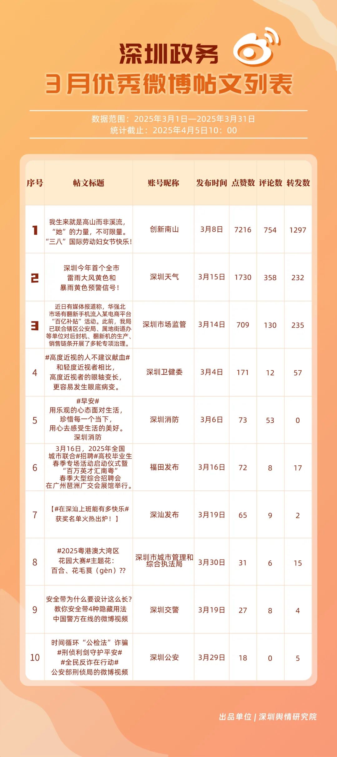 3月,“深圳天氣”“創(chuàng)新南山”“深圳衛(wèi)健委”“深圳消防”“福田發(fā)布”“深圳應(yīng)急管理”“深圳公安”“深圳市場(chǎng)監(jiān)管”“深圳龍崗發(fā)布”“深圳市城市管理和綜合執(zhí)法局”等20個(gè)賬號(hào)入選“優(yōu)秀政務(wù)微博號(hào)”。值得一提的是,“深圳天氣”賬號(hào)在3月共獲得點(diǎn)贊超11萬,相較其他賬號(hào)具備顯著優(yōu)勢(shì)?!皠?chuàng)新南山”“深圳衛(wèi)健委”“深圳消防”也位列前茅,分差微小,競(jìng)爭(zhēng)激烈。從領(lǐng)域分布來看,上榜賬號(hào)不僅包括區(qū)級(jí)賬號(hào),還涵蓋民生服務(wù)、應(yīng)急科普、城市治理等單位賬號(hào),體現(xiàn)了深圳政務(wù)新媒體在多領(lǐng)域的強(qiáng)大影響力。