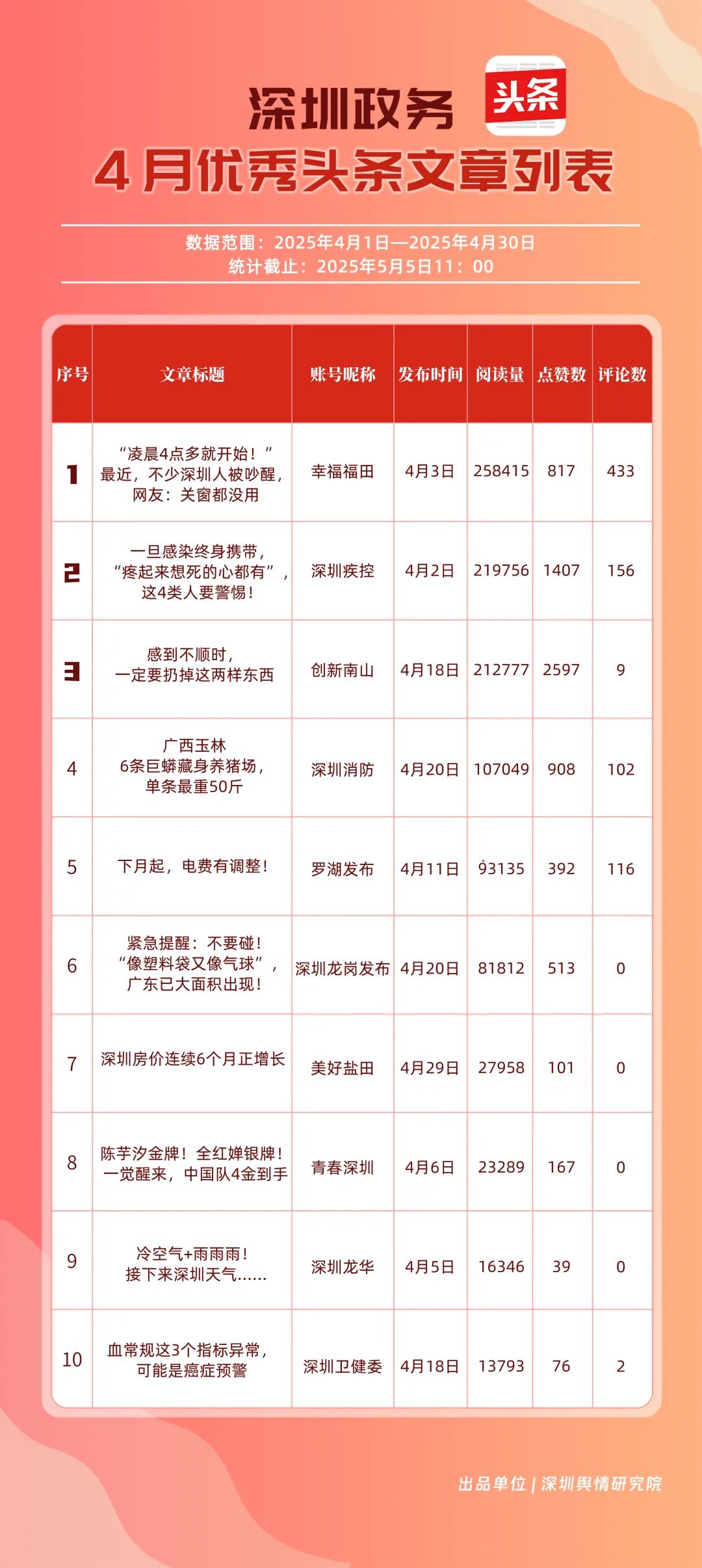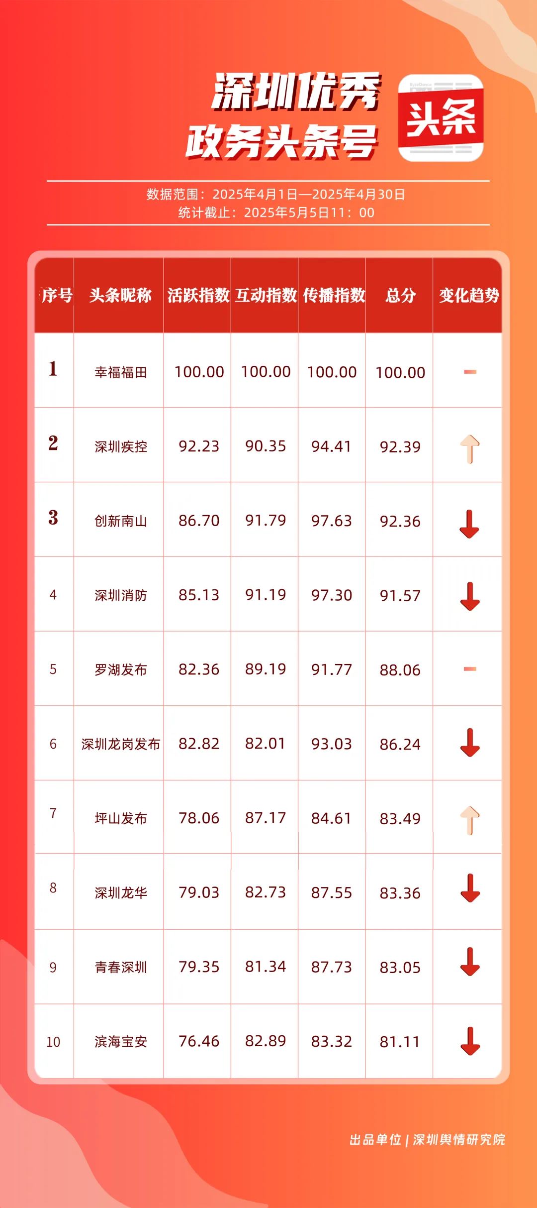 4月,“幸福福田”“深圳疾控”“創(chuàng)新南山”“深圳消防”“羅湖發(fā)布”“深圳龍崗發(fā)布”“坪山發(fā)布”“深圳龍華”“青春深圳”“濱海寶安”共10個(gè)政務(wù)頭條號(hào)入選“優(yōu)秀政務(wù)頭條號(hào)”榜單?!靶腋8L铩毖永m(xù)上月的優(yōu)異表現(xiàn),以優(yōu)質(zhì)的內(nèi)容輸出和穩(wěn)定的用戶互動(dòng),位列榜單首位,成為政務(wù)頭條號(hào)的標(biāo)桿;“深圳疾控”則以92.39分的亮眼成績(jī)排在榜單第二位,凸顯了政務(wù)新媒體在公共衛(wèi)生領(lǐng)域的傳播成果;“創(chuàng)新南山”“深圳消防”“羅湖發(fā)布”緊隨其后,分別在城區(qū)形象宣傳、消防安全領(lǐng)域等方面深耕細(xì)作,持續(xù)擴(kuò)大政務(wù)信息的覆蓋面與影響力。