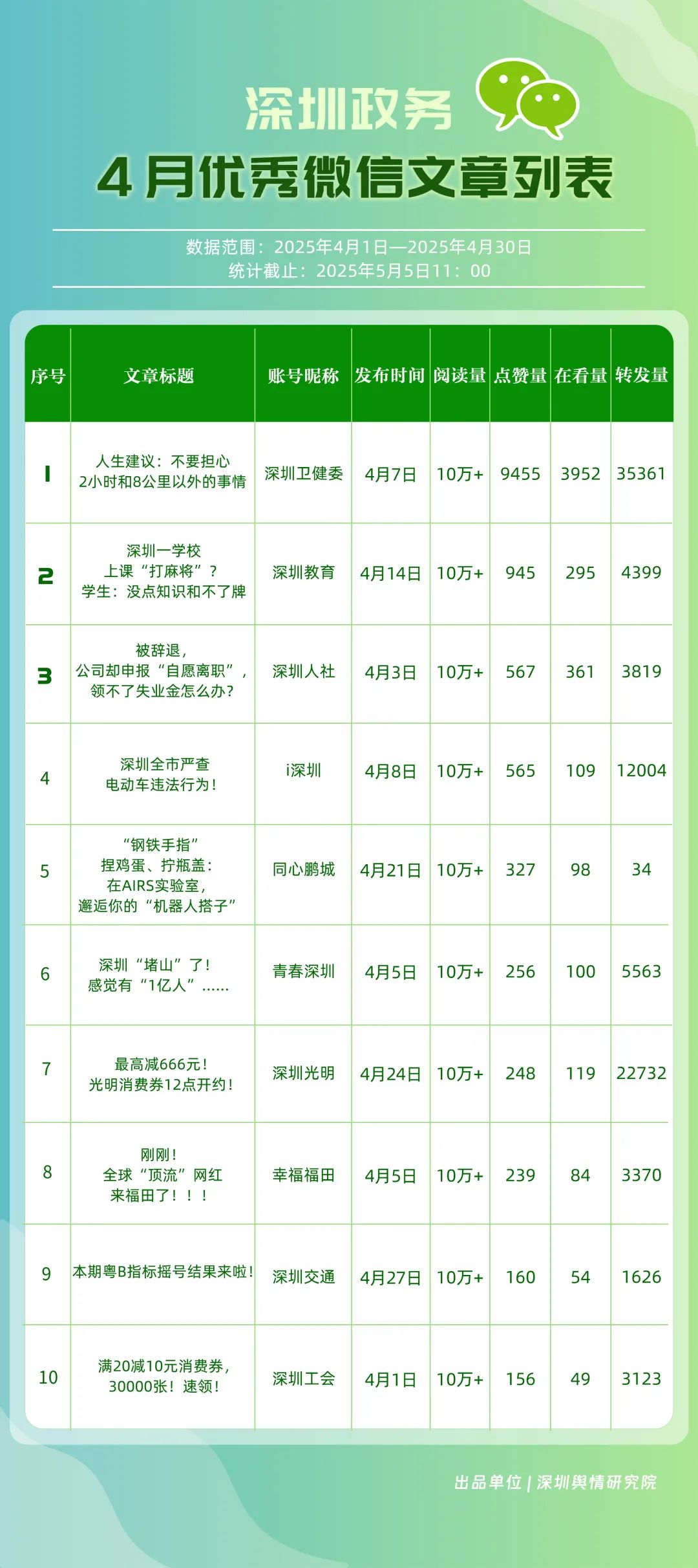 4月,包括“深圳衛(wèi)健委”“深圳龍崗發(fā)布”“幸福福田”“深圳光明”“i深圳”“創(chuàng)新南山”“青春深圳”“深圳交通”“深圳教育”“濱海寶安”等在內(nèi)的30個(gè)賬號(hào)入選“深圳優(yōu)秀政務(wù)微信公眾號(hào)”。其中,“深圳衛(wèi)健委”在活躍指數(shù)、互動(dòng)指數(shù)、傳播指數(shù)上均拿到滿分,4月共有67篇推文閱讀量超10萬(wàn)次,綜合得分穩(wěn)居榜單首位;“深圳龍崗發(fā)布”同樣表現(xiàn)亮眼,4月共產(chǎn)出13篇閱讀量超10萬(wàn)次的爆款文章,綜合得分排名第二位;“幸福福田”則憑借持續(xù)輸出的高質(zhì)量?jī)?nèi)容,排在榜單第三位?!吧钲诠饷鳌薄癷深圳”“創(chuàng)新南山”“青春深圳”也憑借扎實(shí)的內(nèi)容功底與良好的運(yùn)營(yíng)策略,總分超85分。上榜賬號(hào)的亮眼成績(jī),不僅彰顯了各自的傳播優(yōu)勢(shì),更展現(xiàn)出各新媒體矩陣在微信公眾平臺(tái)的傳播勢(shì)能正持續(xù)攀升。