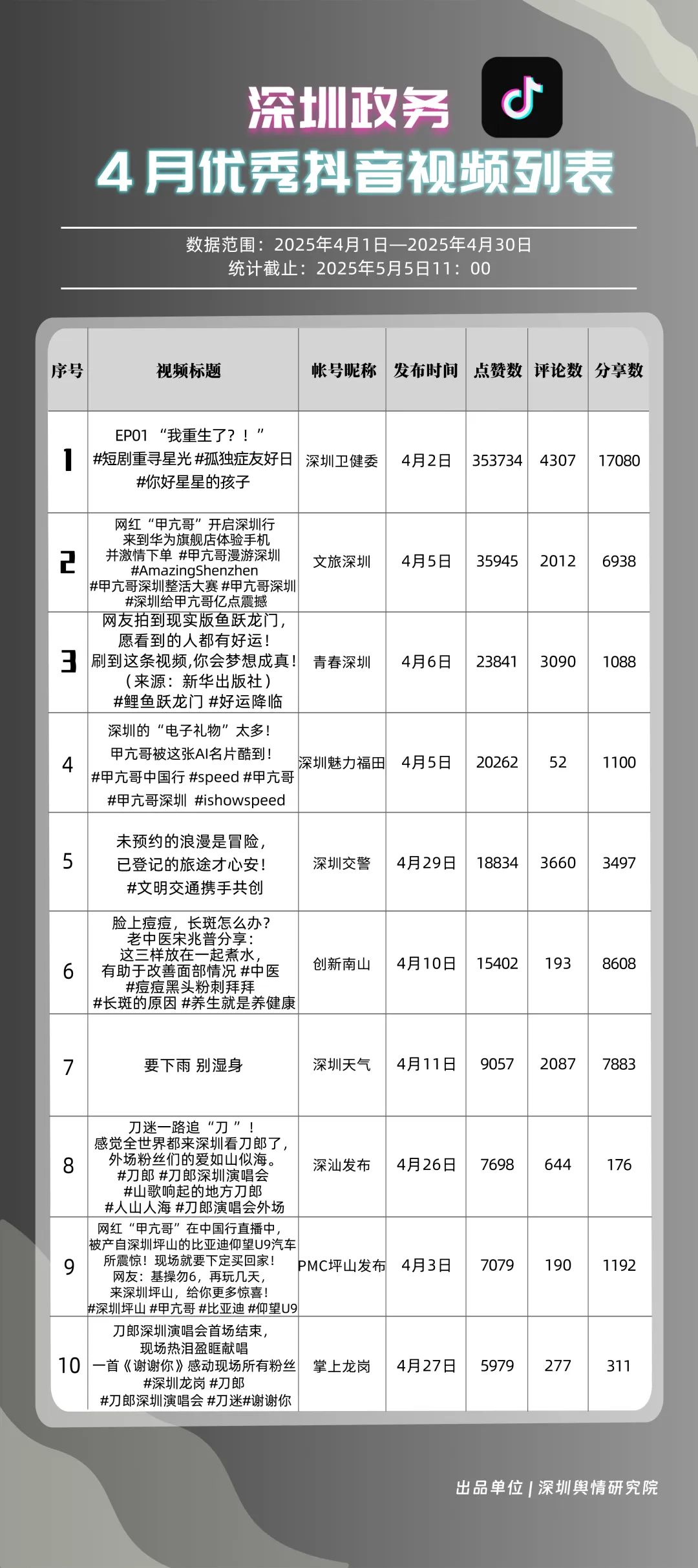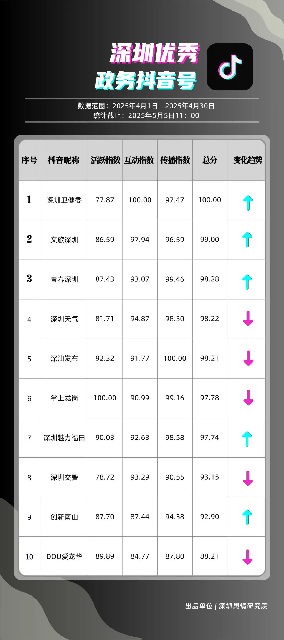 4月,“深圳衛(wèi)健委”“文旅深圳”“青春深圳”“深圳天氣”“深汕發(fā)布”“掌上龍崗”“深圳魅力福田”“深圳交警”“創(chuàng)新南山”“DOU愛(ài)龍華”共10個(gè)政務(wù)抖音號(hào)獲得“優(yōu)秀政務(wù)抖音號(hào)”稱號(hào)。4月,“深圳衛(wèi)健委”“文旅深圳”“青春深圳”憑借新穎的內(nèi)容策劃、生動(dòng)的短視頻呈現(xiàn)方式,實(shí)現(xiàn)排名提升,位居榜單前三?!吧钲谔鞖狻薄吧钌前l(fā)布”緊隨其后,以優(yōu)質(zhì)實(shí)用的內(nèi)容、接地氣的表達(dá),持續(xù)擴(kuò)大政務(wù)新媒體的傳播聲量。上榜賬號(hào)積極探索創(chuàng)新傳播路徑,以生動(dòng)有趣的方式傳遞政務(wù)信息,為深圳政務(wù)新媒體在短視頻領(lǐng)域的發(fā)展注入新活力。