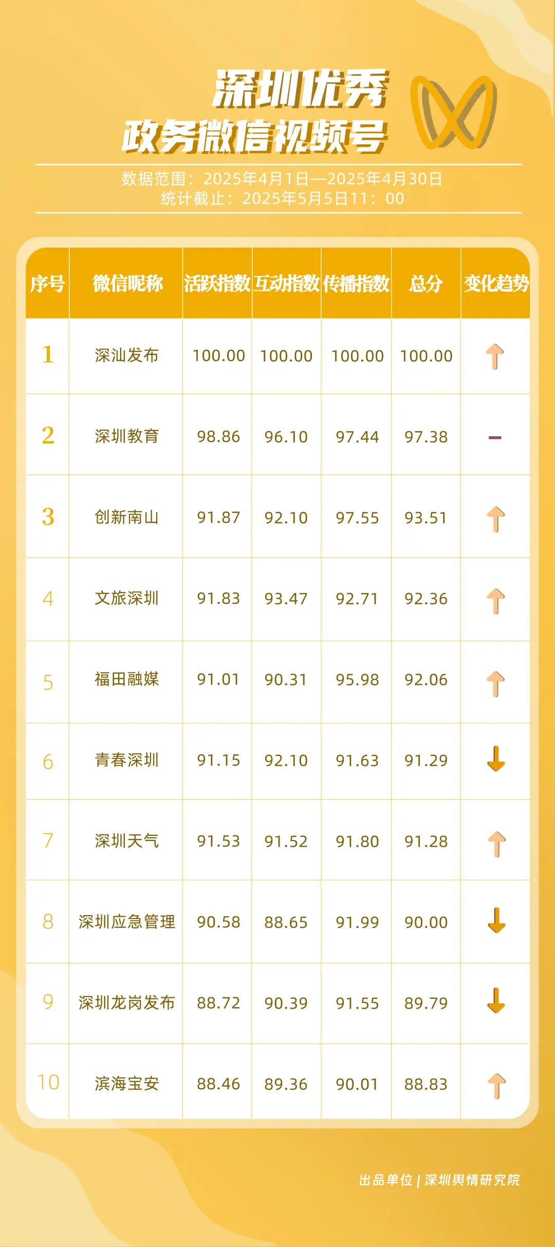 《深圳優(yōu)秀政務(wù)新媒體矩陣》由深圳輿情研究院推出,旨在通過(guò)對(duì)深圳黨政機(jī)關(guān)、企事業(yè)單位開設(shè)的政務(wù)新媒體進(jìn)行持續(xù)觀察、定期評(píng)估,展現(xiàn)政務(wù)新媒體的建設(shè)管理水平及公眾認(rèn)可度,同時(shí)發(fā)揮好媒體的宣傳監(jiān)督作用,推動(dòng)政務(wù)新媒體矩陣規(guī)范有序發(fā)展。