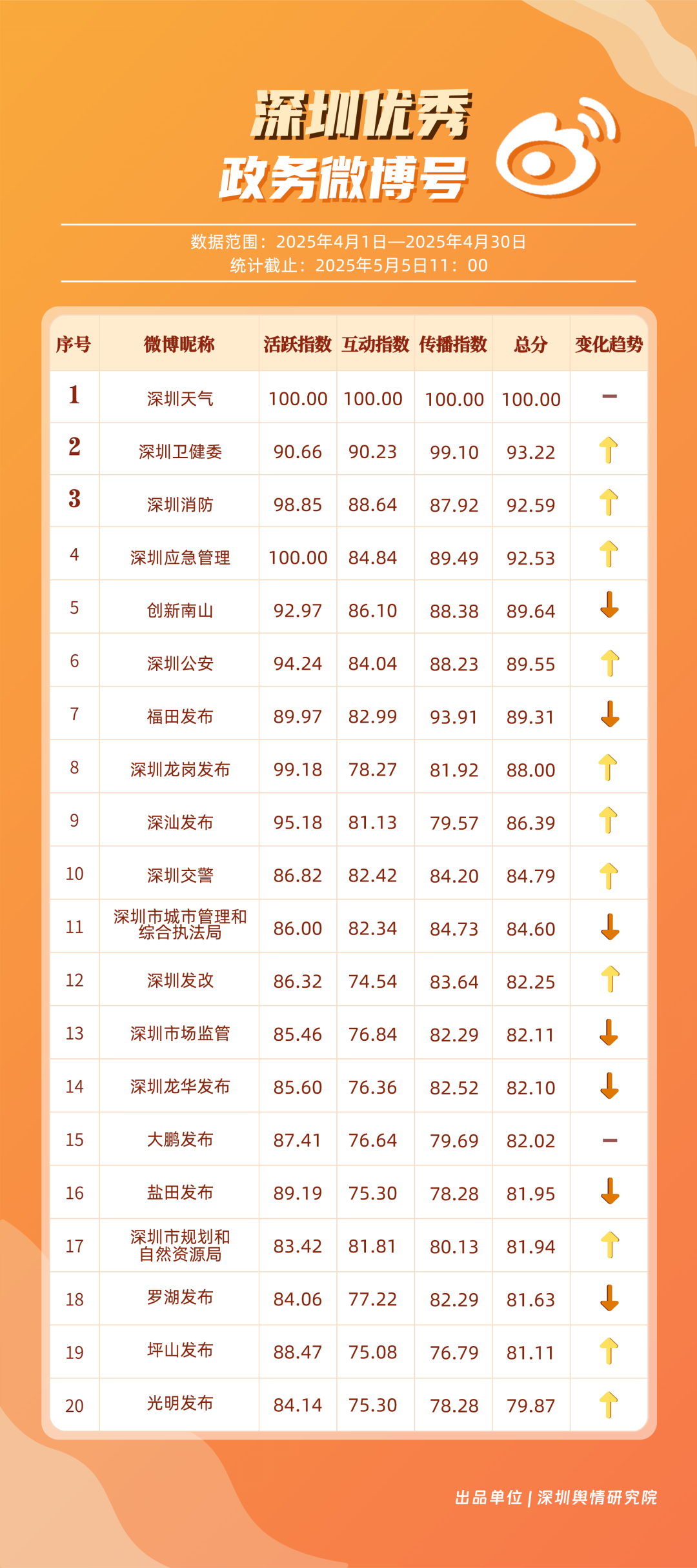 4月,“深圳天氣”“深圳衛(wèi)健委”“深圳消防”“深圳應(yīng)急管理”“創(chuàng)新南山”“深圳公安”“福田發(fā)布”“深圳龍崗發(fā)布”“深汕發(fā)布”“深圳交警”等20個(gè)賬號(hào)入選“優(yōu)秀政務(wù)微博號(hào)”。值得一提的是,“深圳天氣”在多個(gè)指標(biāo)中獲得滿分,其氣象信息的趣味性和實(shí)用性受到市民認(rèn)可;“深圳衛(wèi)健委”“深圳消防”“深圳應(yīng)急管理”也在信息傳播、互動(dòng)服務(wù)等方面持續(xù)發(fā)力,以超過(guò)90分的總分緊跟其后;“深汕發(fā)布”“深圳交警”相較于3月在榜單排名有所提升,展現(xiàn)出強(qiáng)勁的發(fā)展勢(shì)頭。這些優(yōu)秀政務(wù)微博號(hào)的脫穎而出,不僅體現(xiàn)了各自的運(yùn)營(yíng)實(shí)力,更反映出深圳政務(wù)新媒體在微博平臺(tái)的蓬勃發(fā)展態(tài)勢(shì)。