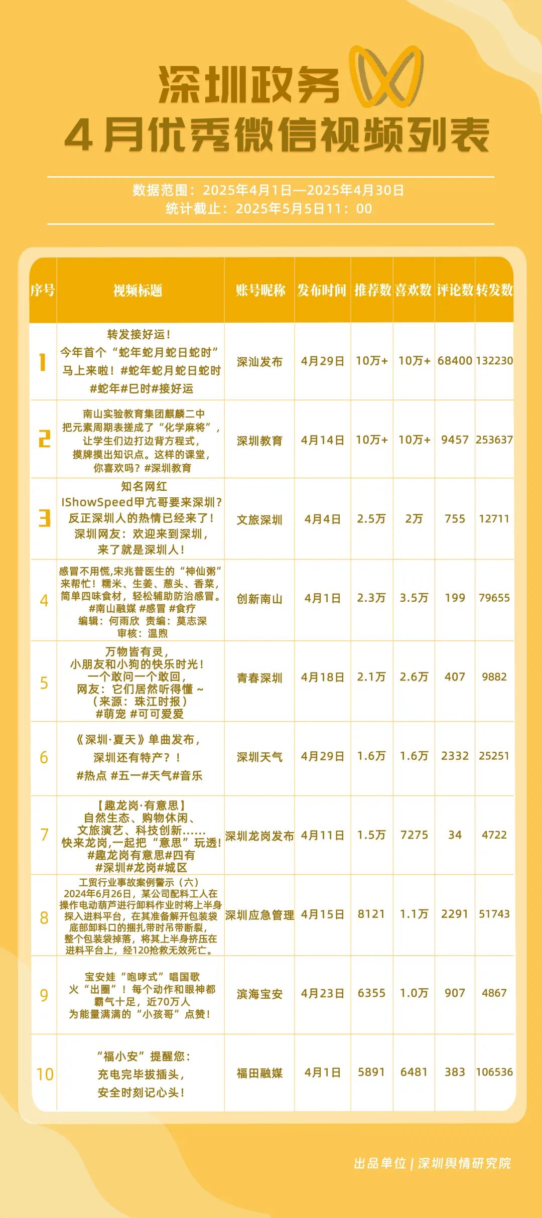 4月,獲“深圳優(yōu)秀政務(wù)微信視頻號(hào)”稱號(hào)的是“深汕發(fā)布”“深圳教育”“創(chuàng)新南山”“文旅深圳”“福田融媒”“青春深圳”“深圳天氣”“深圳應(yīng)急管理”“深圳龍崗發(fā)布”“濱海寶安”。其中,“深汕發(fā)布”憑借亮眼的數(shù)據(jù)表現(xiàn)成為榜首,其一條有關(guān)“蛇年蛇月蛇日蛇時(shí)”的視頻作品點(diǎn)贊量超10萬(wàn)次、評(píng)論量超6.8萬(wàn)次,轉(zhuǎn)發(fā)量超13萬(wàn)次;“深圳教育”持續(xù)穩(wěn)定輸出優(yōu)質(zhì)內(nèi)容,以扎實(shí)的運(yùn)營(yíng)實(shí)力鞏固自身影響力,位居榜單第2位;“創(chuàng)新南山”“文旅深圳”“福田融媒”分別位列榜單第3、4、5位,總分超92分,在區(qū)域形象宣傳、文旅資源推廣等方面展現(xiàn)出卓越的傳播效能,成為傳遞區(qū)域特色與發(fā)展動(dòng)態(tài)的重要窗口。