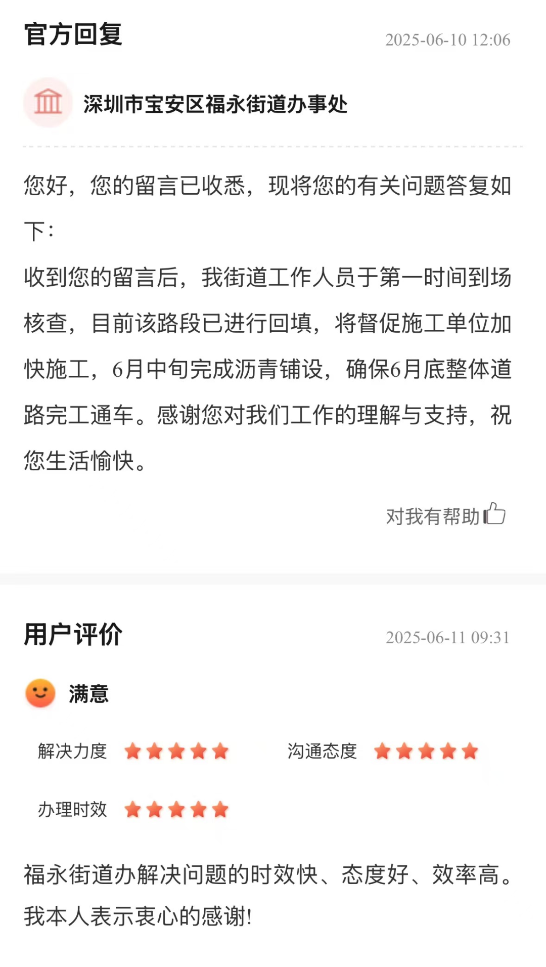 案例點(diǎn)評(píng):道路銜接處的大坑大坎影響通行安全與道路順暢,亟待解決。街道辦收到留言后迅速行動(dòng),第一時(shí)間到場(chǎng)核查,明確將督促施工單位加快進(jìn)度,在預(yù)計(jì)時(shí)間內(nèi)完成瀝青鋪設(shè)及道路整體完工,這些舉措體現(xiàn)了對(duì)道路通行問(wèn)題的重視和高效的處理能力,為保障道路正常通行提供了有力保障,獲得了市民的滿意評(píng)價(jià)。