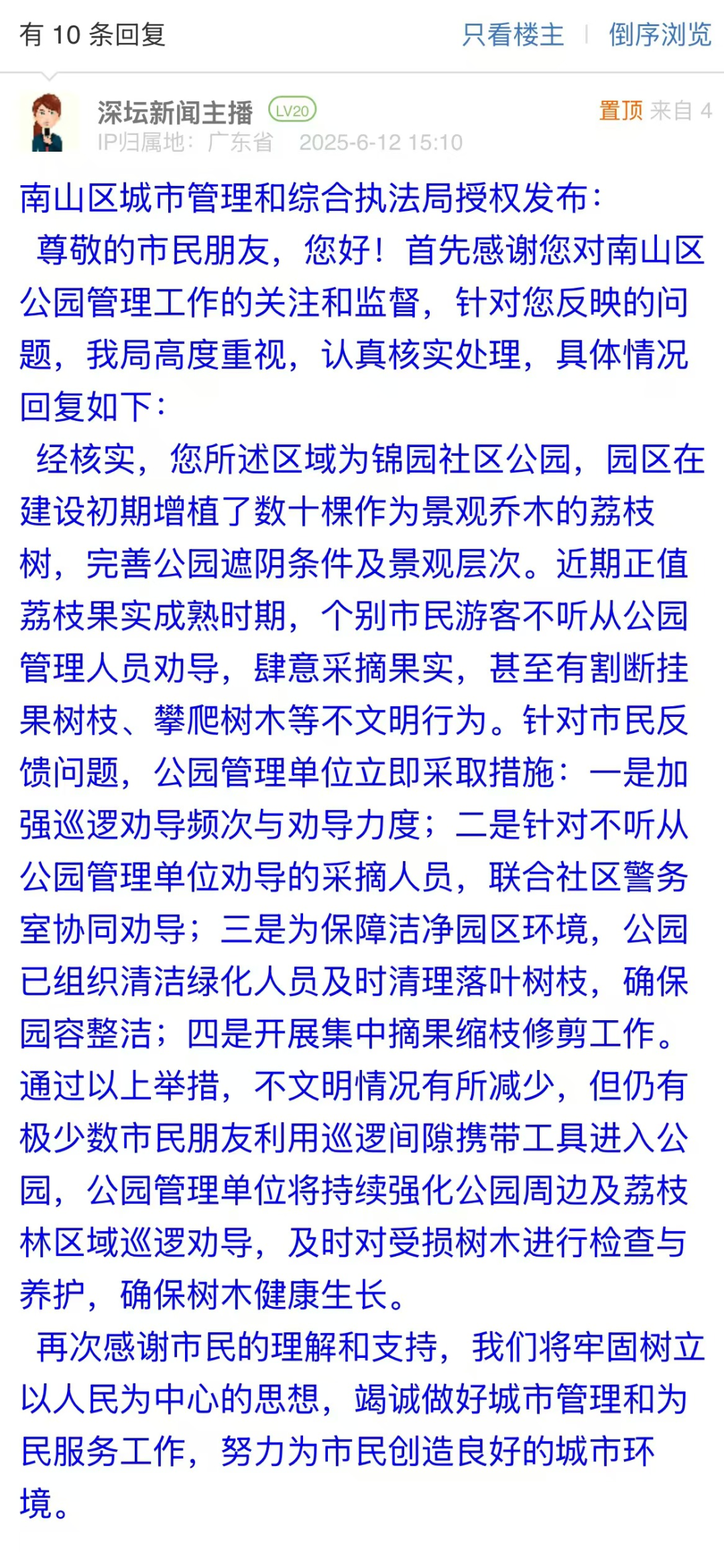 案例點(diǎn)評(píng):接到市民反映問(wèn)題后,南山區(qū)城市管理和綜合執(zhí)法局以快速響應(yīng)展現(xiàn)責(zé)任擔(dān)當(dāng)。通過(guò)“強(qiáng)化巡邏”“聯(lián)動(dòng)執(zhí)法”“環(huán)境清理”“科學(xué)修剪”四大舉措,遏制采摘亂象,最大程度地保障樹木健康與園區(qū)整潔。該部門將動(dòng)態(tài)監(jiān)督機(jī)制與跨部門協(xié)作相結(jié)合,及時(shí)化解民生問(wèn)題,為城市公共資源保護(hù)提供了可借鑒的治理范式。