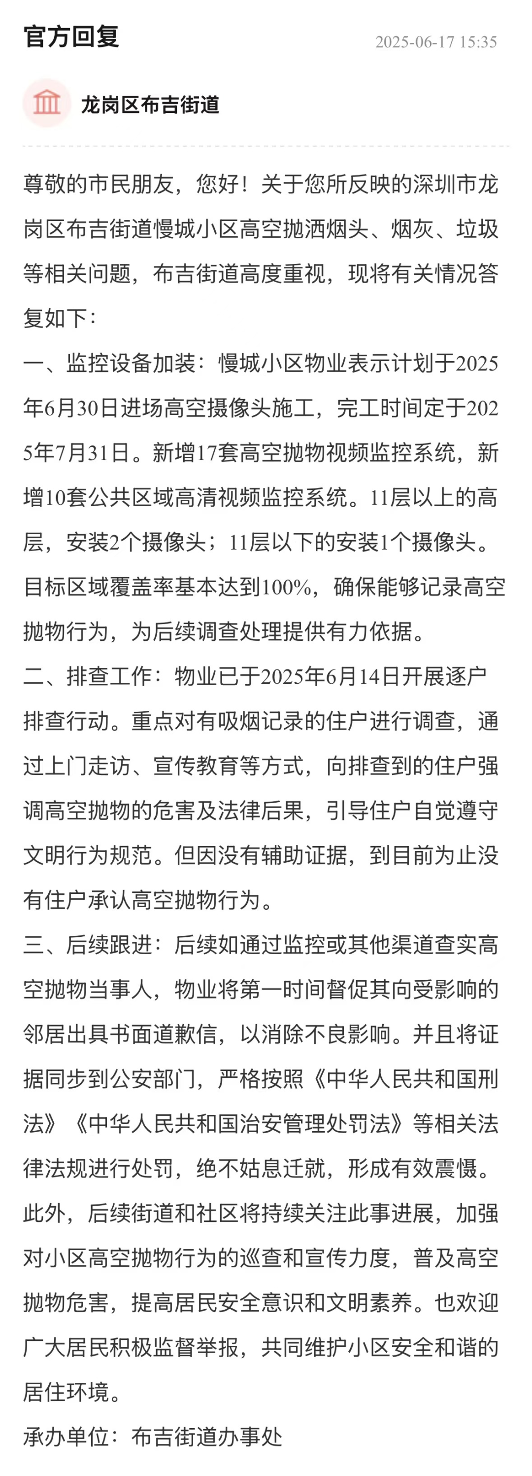 高空拋物嚴(yán)重威脅居民人身與財(cái)產(chǎn)安全,需嚴(yán)肅對(duì)待。街道辦接到相關(guān)反映后,積極推動(dòng)物業(yè)規(guī)劃加裝視頻監(jiān)控系統(tǒng),明確了施工和完工時(shí)間,同時(shí)安排物業(yè)開展逐戶排查,重點(diǎn)調(diào)查有吸煙記錄住戶,體現(xiàn)出對(duì)問(wèn)題的重視和解決問(wèn)題的行動(dòng)力。在后續(xù)保障方面,明確查實(shí)拋物當(dāng)事人后將督促其道歉并交由公安部門依規(guī)處罰,街道和社區(qū)也將持續(xù)關(guān)注、加強(qiáng)巡查與宣傳,為維護(hù)小區(qū)安全提供了有力支持。